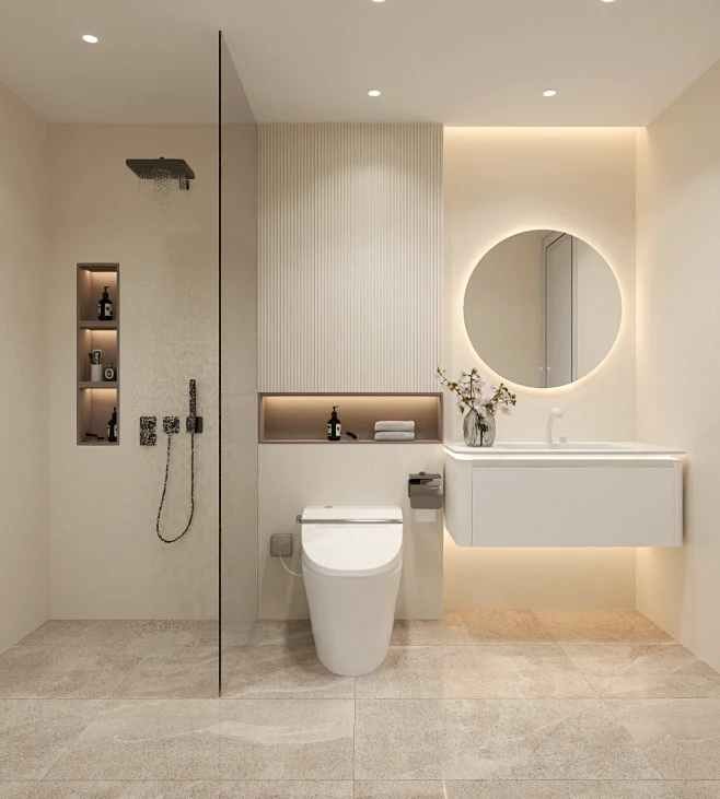 2. 壁龛高度根据常用物品设计(如洗发水约25cm高),避免过高浪费空间;