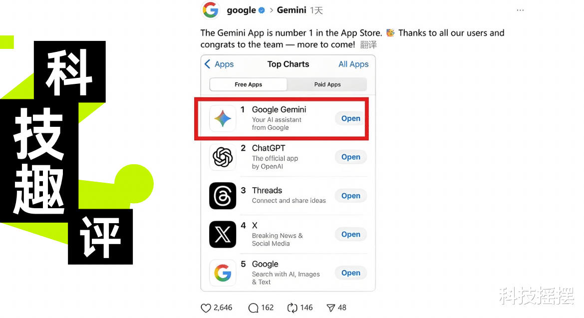 9月中旬,谷歌Gemini应用在苹果App Store的排名升至第一位,超过了此前排名靠前的ChatGPT。