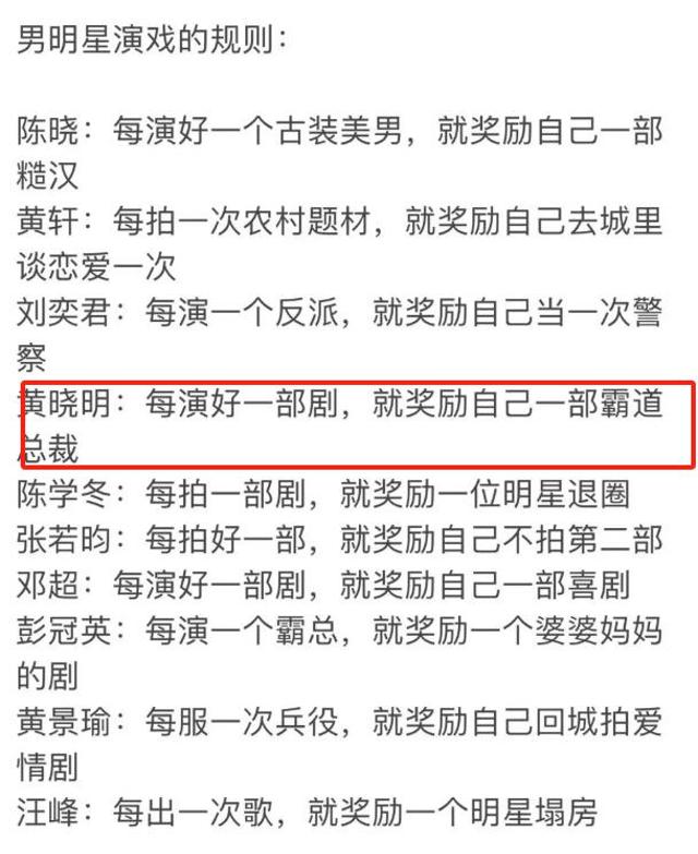 早些年的黄晓明还因为迷之自信被人嘲讽,有人总结了他的拍戏规律,发现他每演一部正剧,总会奖励自己拍一部霸道总裁剧,他一演偶像剧,就容易暴露出一种迷之优越感,败坏了他的形象。