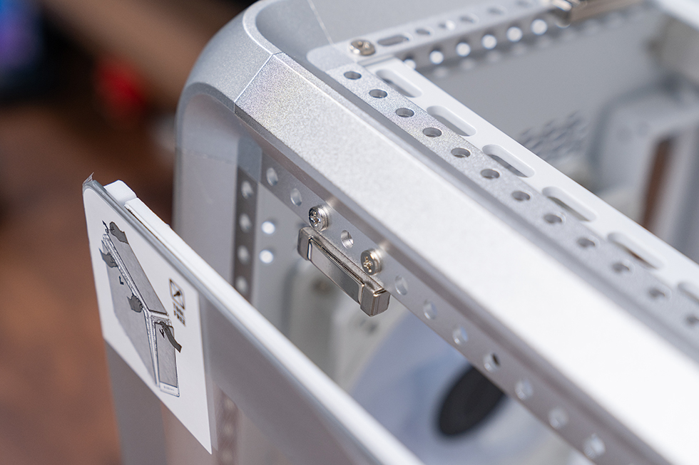 箱采用 FreeForm 2.0 全模组化框架,框架上的螺丝孔位提供了极高的安装自由度。内部结构默认是电源前置的紧凑型 M-ATX 结构,主板侧支持 ITX/M-ATX 主板,并预留了 M-ATX 的背插接.口。硬盘位通过配件盒里的多功能金属条杆来实现,安装位在底部,可安装 1 个 3.5 英寸或 1 个 2.5 英寸硬盘。此外,机箱还提供了电源线挡板,有助于整理线缆,使整机外观更整洁。