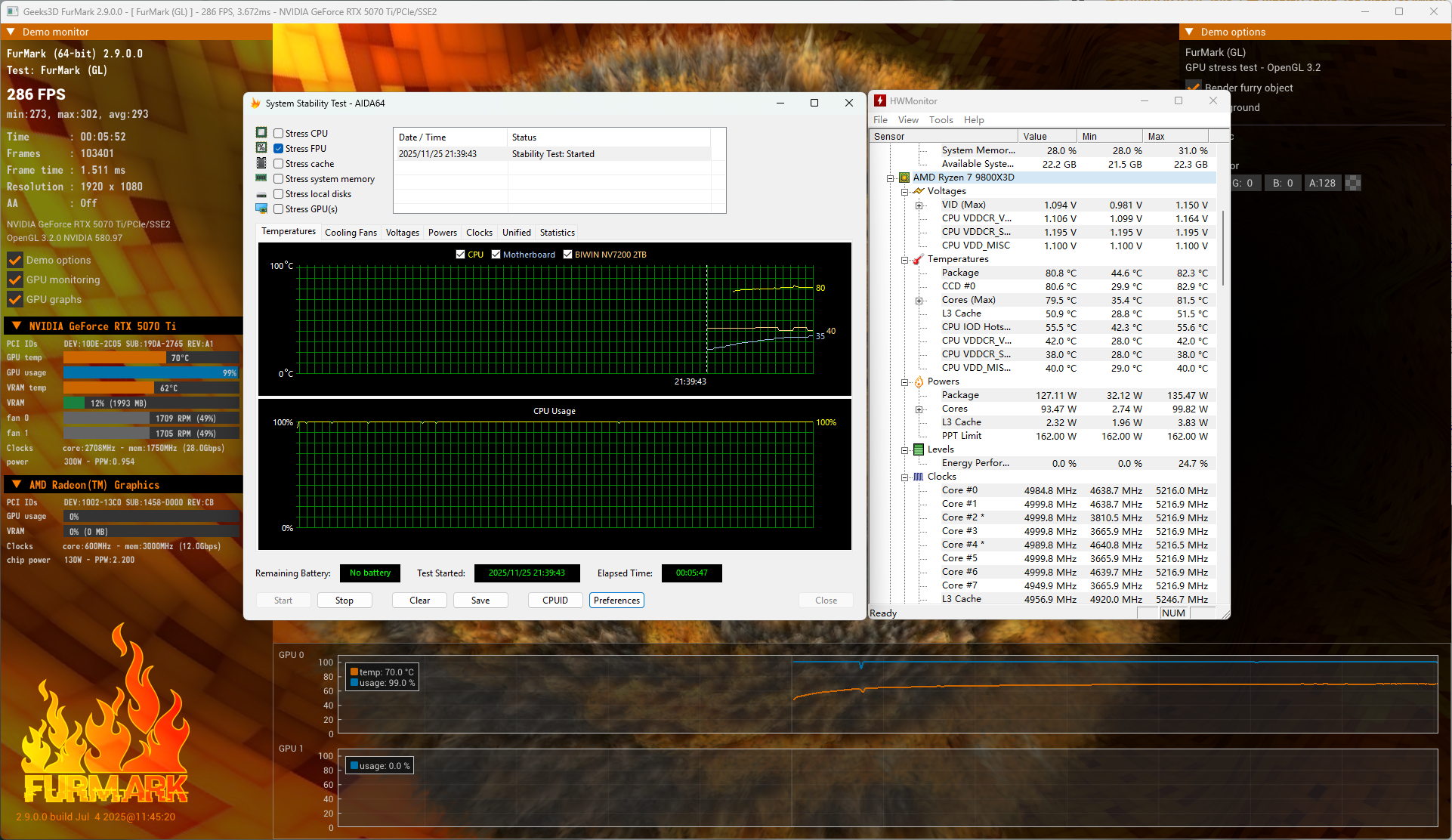 双烤温度测试,PBO2开启 ,CPU峰值功耗 135W,最高温度82.3℃,显卡温度70℃。