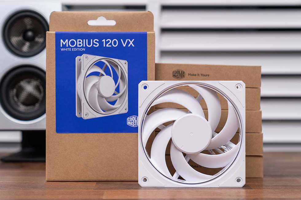机箱风扇采用酷冷至尊的莫比乌斯120 VX,全新的环保包装,相对于散热器默认配备的莫比乌斯120P,采用了同样的轴承和材质工艺,不过在转速和风压风量上略有区别,莫比乌斯120 VX 的 转速区间 0~2050+10% RPM,最大风量 63.1 CFM,最大静压 2.69 mmH2O,最大噪声 22.6 dB(A)。