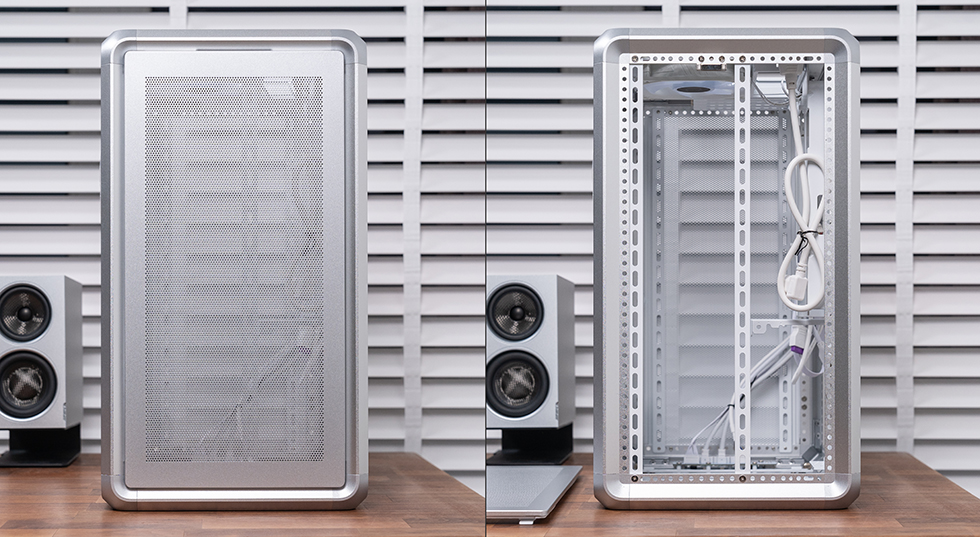 酷冷至尊 MasterFrame 400 Mesh 继承了 MasterFrame 系列的轻奢外观。整体尺寸为471x261x373.8mm,体积为46L。其外框架采用铝合金材料,经独特的圆角切割和处理工艺,在灯光照射下呈现出自然的金属光泽,显得冷艳高贵。机箱可支持横卧与立置两种安装方向,适应不同的使用环境。