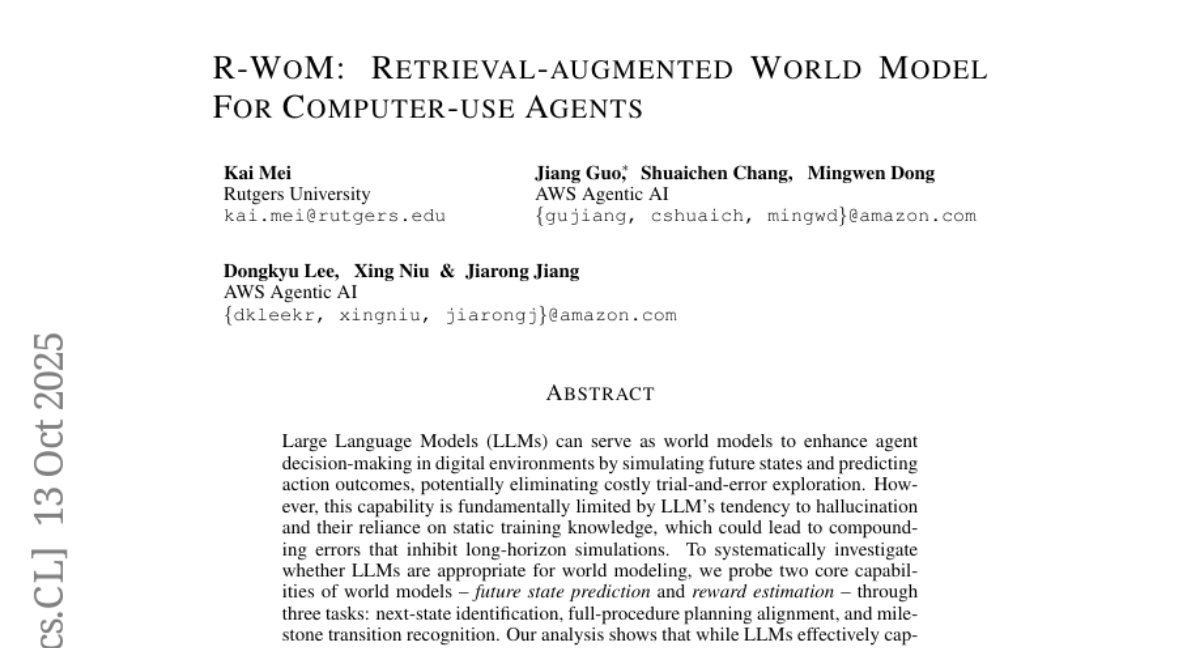 A:R-WoM(检索增强世界模型)是由罗格斯大学和AWS团队开发的新型AI系统,它能让人工智能在执行计算机操作前先"想象"可能的结果,同时查阅最新的操作手册和教程来确保预测的准确性,就像给AI装上了一个会查资料的"想象力引擎"。