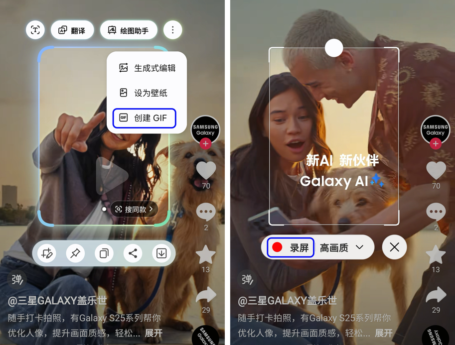截图是智能手机上习以为常的基本操作,三星Galaxy S25系列带来AI多截图功能,通过多模态感知能力分析用户截取的画面内容,预判用户的下一步操作,并给出操作选项。例如,如果用户截取的是外文内容,AI多截图就会主动提供翻译选项,如果截取的是视频画面,还可以提供“创建GIF”选项,让用户一键生成GIF动图。