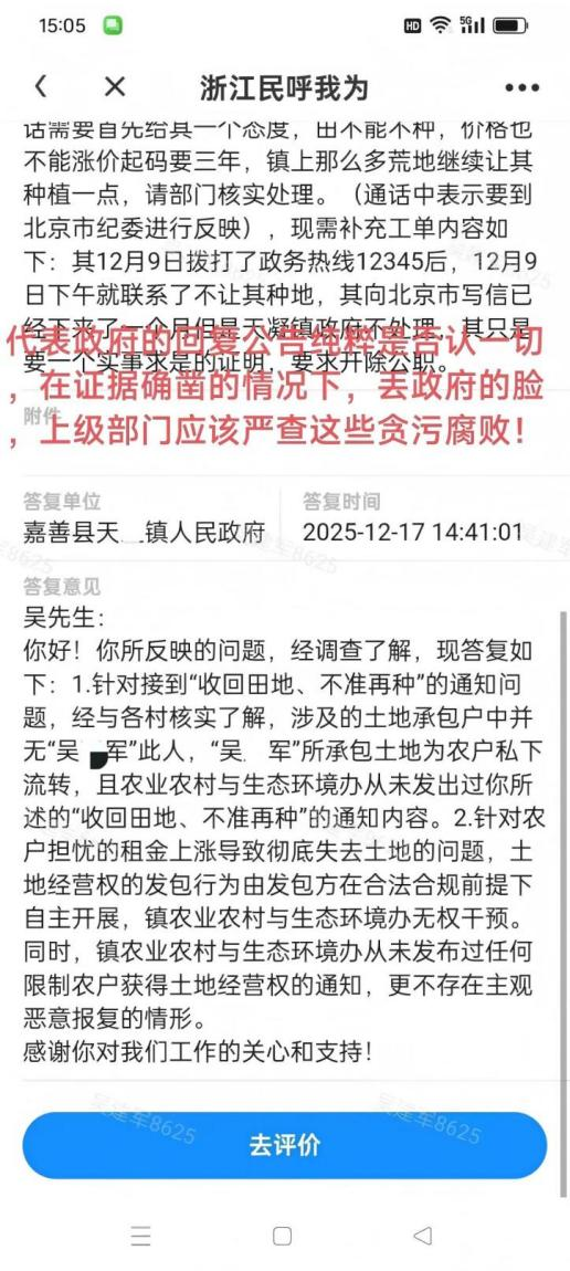2025年12月17日,天凝镇政府在相关平台作出回应,称吴某军承包的土地为农户私下流转,农业农村办未发出过收回通知。