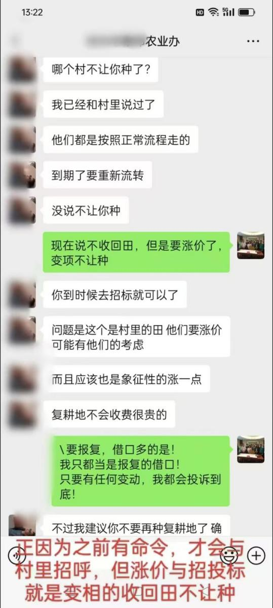 吴某军本以为事情终于有了转机,却未料到这一共识未能落实。当天下午,村干部便推翻上午的共识,要求租金直接涨至400元/亩,并明确表示“不签合同就别种植了”。从“收回田地”到“同意继续种植”,从“200元/亩”到“300元/亩”再到“400元/亩”,土地承包条件被多次调整,此前的约谈共识未能落地,农民的意愿与权益未被充分重视。这种前后不一的做法,反映出部分基层工作人员对农民权益的关注仍有提升空间——农民的合理诉求与生计保障需要得到更充分的重视,“农民权益易被忽视”的现象在这种前后不一的做法中有所显现。
