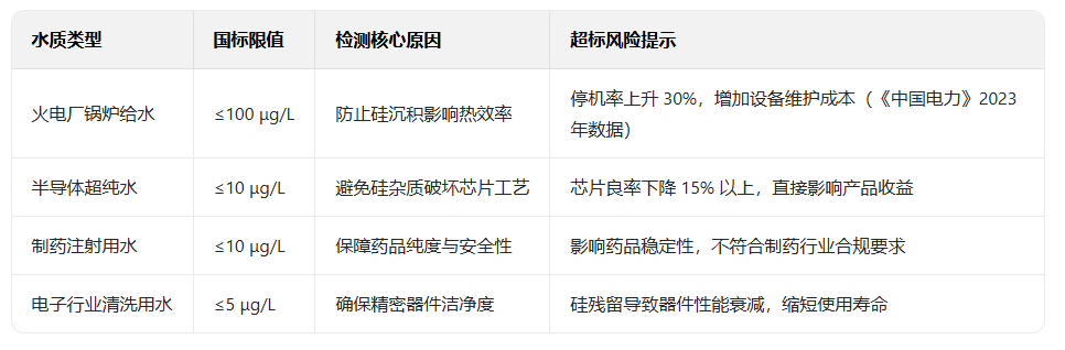不同水质的二氧化硅含量直接关联生产安全与产品质量,国标对各类水质的硅含量均有明确限值,核心要求如下: