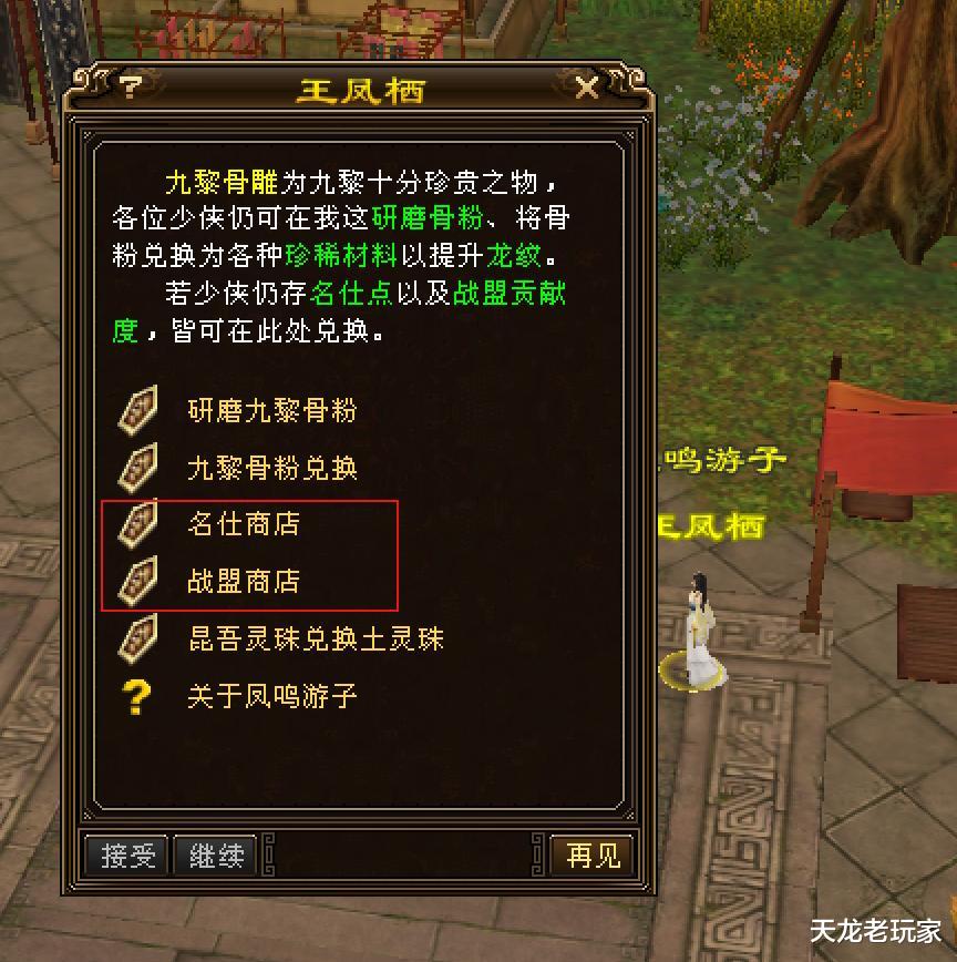 如果没有中都铸币怎么办?没关系,再来凤鸣镇(286,51)找到NPC王凤栖,点开对话有两个商店: