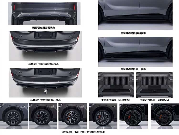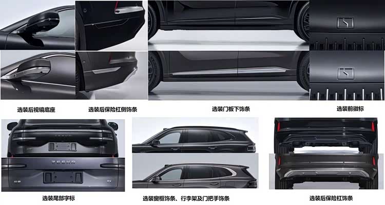 从工信部最新一期的申报信息来看,极氪8X前脸整体延续了极氪家族的设计,和极氪9X有些相似,一样采用瀑布型中网格栅,有镀铬和熏黑两种选择,车顶也有激光雷达,但灯组设计稍有不同。