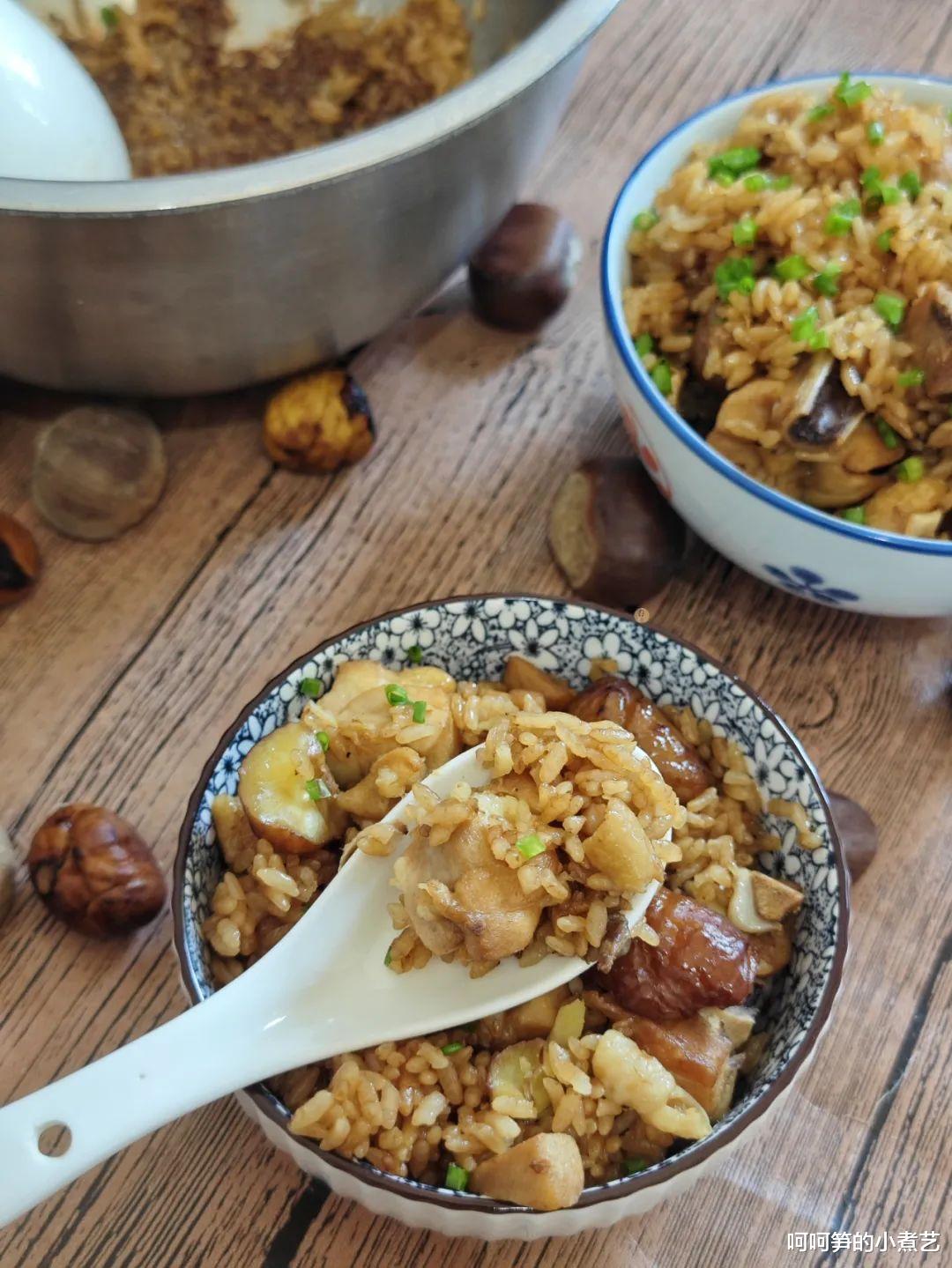 板栗烧鸡,栗子甜糯入味,鸡肉滑嫩鲜美,米饭香甜入味,越吃越香。