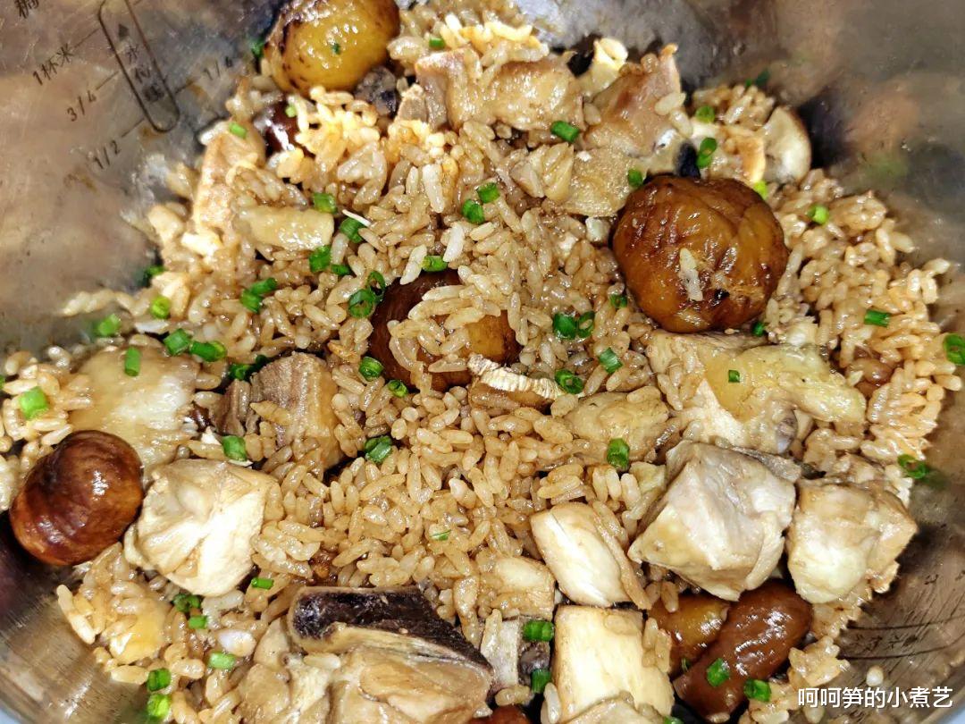 倒入与平时煮米饭相同量的板栗烧鸡汤汁,焖米饭。