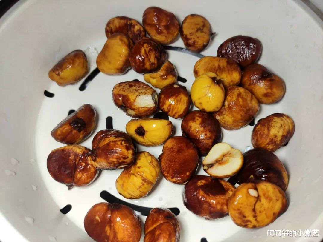 ♡将板栗放入烧好的开水中焖5分钟。取出后用小刀或剪刀开口,沿着开口即可剥出板栗肉。