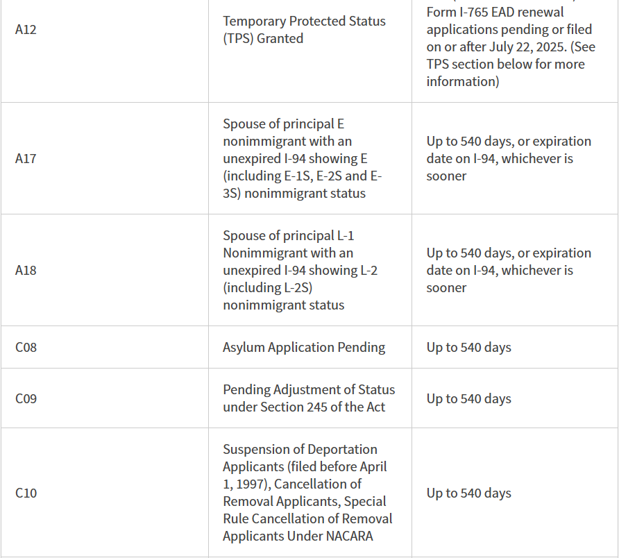这项新规推翻了拜登政府时期实施的临时政策。该政策原允许在移民局处理续签申请期间,工作许可可自动延长最多540天。新规生效后,自动延期机制将被彻底取消,移民必须等待续签获批后才能继续合法就业。国土安全部表示,此举旨在强化移民背景审查和安全筛查,确保每次续签都在“全面审查后”才能批准。美国公民及移民服务局(USCIS)局长埃德洛(Joseph Edlow)在声明中表示:“USCIS正在重新强调对外国人的严格筛查,废除那些将外国人便利置于美国安全之上的政策。美国的工作是一种特权,而不是一项权利。”Eligible for Automatic Extension的工卡类别名单,这些类别中只有TPS的工作许可可不受新规影响,依旧可以获得自动延期: