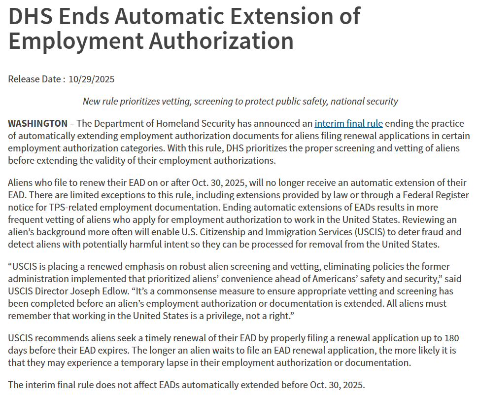 美国国土安全部DHS于今日公布最新消息,将从2025年10月30日起,不再为提交工作许可(EAD,简称“工卡”)续期申请的外国人自动延长(automatic extension)工卡。这意外着大多数在2025年10月30日之后申请工卡续期(renewal)的人不会在等待续期期间自动获得工卡延期,也就不能在等候期间合法工作,除非法律明确给出自动延期(例如临时保护身份TPS获得者)。这个政策变化将影响数十万依赖于工卡持续的员工和雇主。