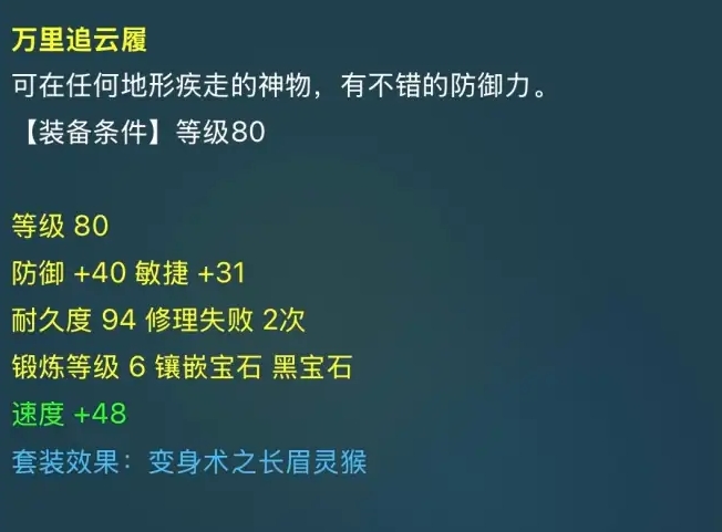 腰带换8段黑宝石,鞋子8段黑宝石,衣服敏魔双加,他这个武器太垃圾,1魔=2.8伤害,还不如买高伤单敏武器,前排灵饰用5段速度法伤的,后排配饰可以用140级28速度以上单气血的,一套四级健步(预算不足用4级五行),法宝带凌波仙符或者双风袋,这一套下来每天打下速度符基本都在600速度以上。