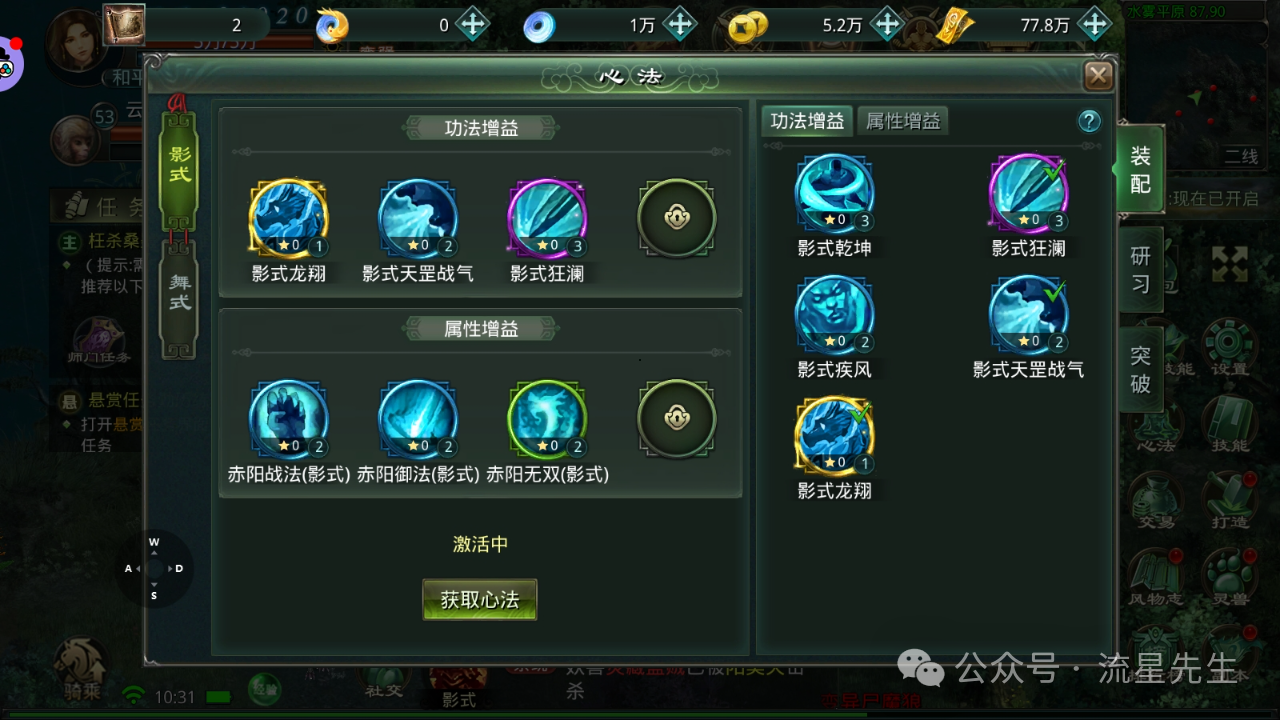 心法研习:在心法研习界面,玩家可以使用心法经验对已获得的心法进行升级。升级后,心法的基础属性和附加技能效果都会得到提升。