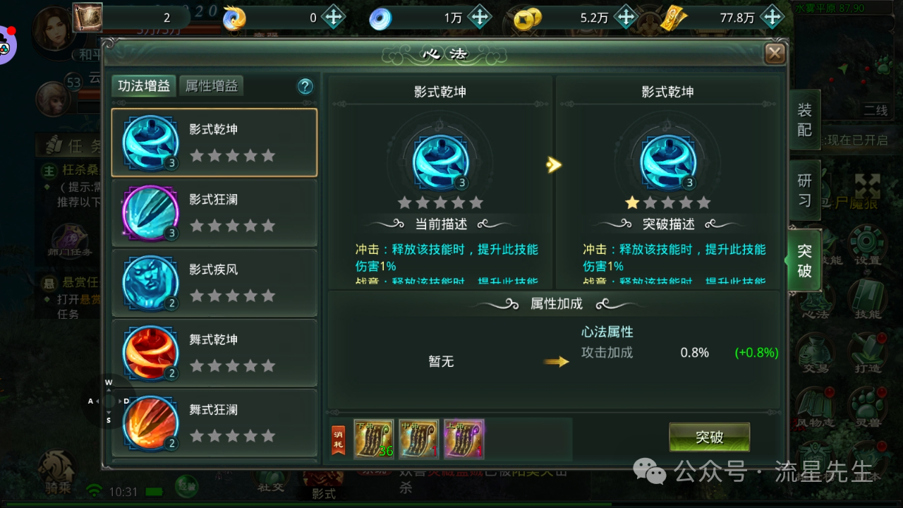 心法突破:在心法突破页签中,玩家可以使用神秘残卷、秘法卷轴、仙法残页等材料对心法进行突破。突破后,心法将获得更高的属性加成和技能效果。