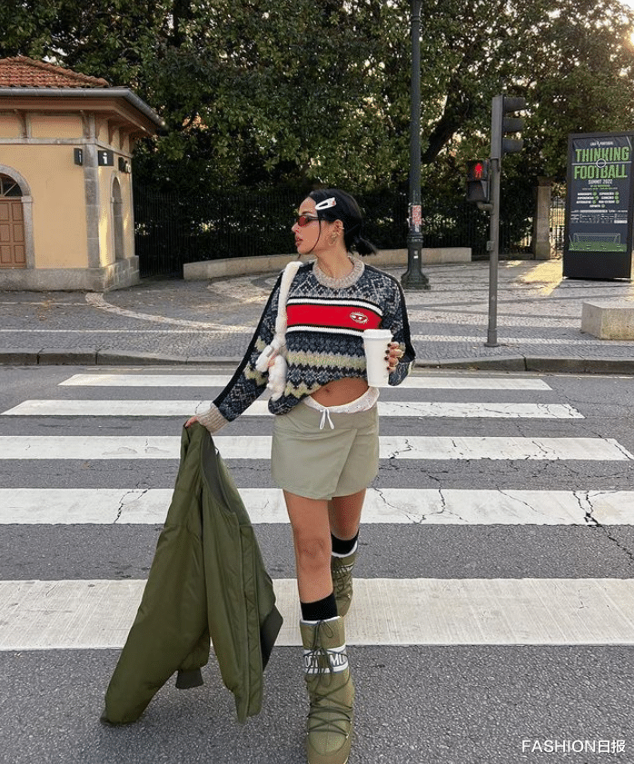 Ines Silva 身穿 MOON BOOT 雪地靴,防水材料配以绑带设计,实用性与美貌兼具!
