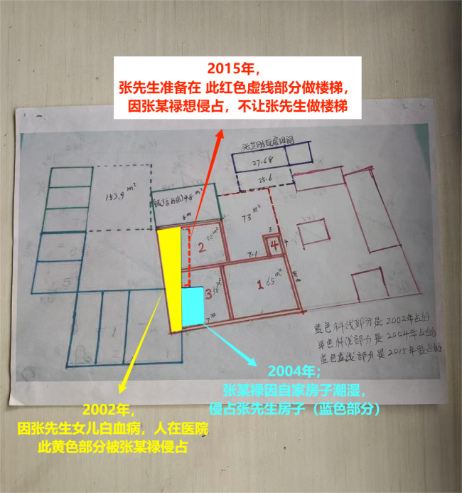 2002年,张先生因女儿患白血病赴天津治疗4个月,张某禄竟趁此空当偷拆了张先生老宅中的2号、3号、4号房屋,共计120平方米,还霸占了60平方米宅基地违规修建了100.3㎡的二层房屋,将侵占行为推向极致。