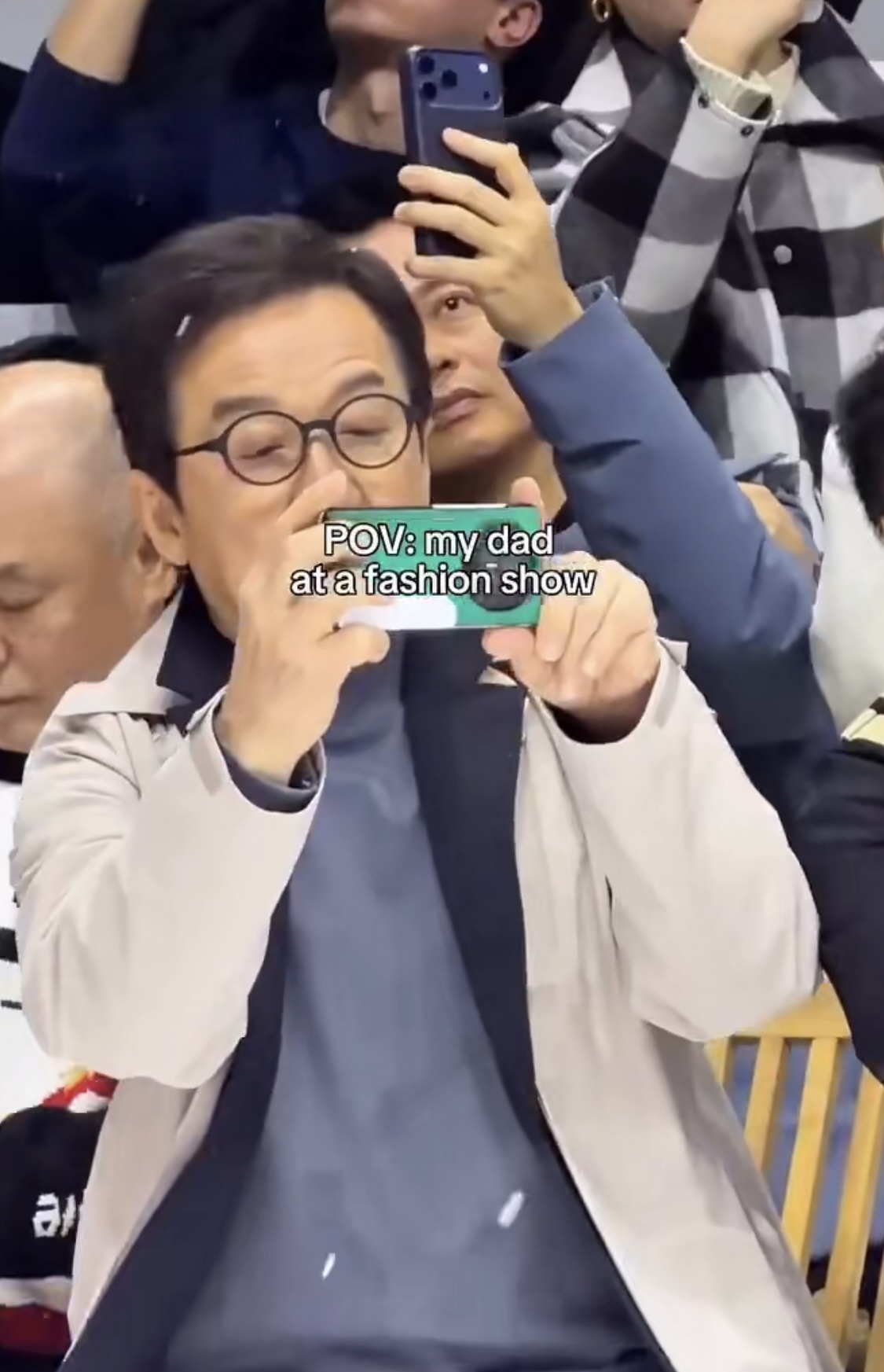 最逗的还不是衣服,是他那张脸上的表情。镜头扫到他时,他正瞪大了眼睛盯着T台,眉头皱得能夹死苍蝇,那股子专注劲儿,跟你爸第一次学着用智能手机刷视频一模一样。他一会儿嘟着嘴琢磨台上的设计,一会儿又掏出手机对着T台咔咔拍照,那副努力想看懂、又有点跟不上趟的认真模样,瞬间被网友做成了表情包,火遍了全网。