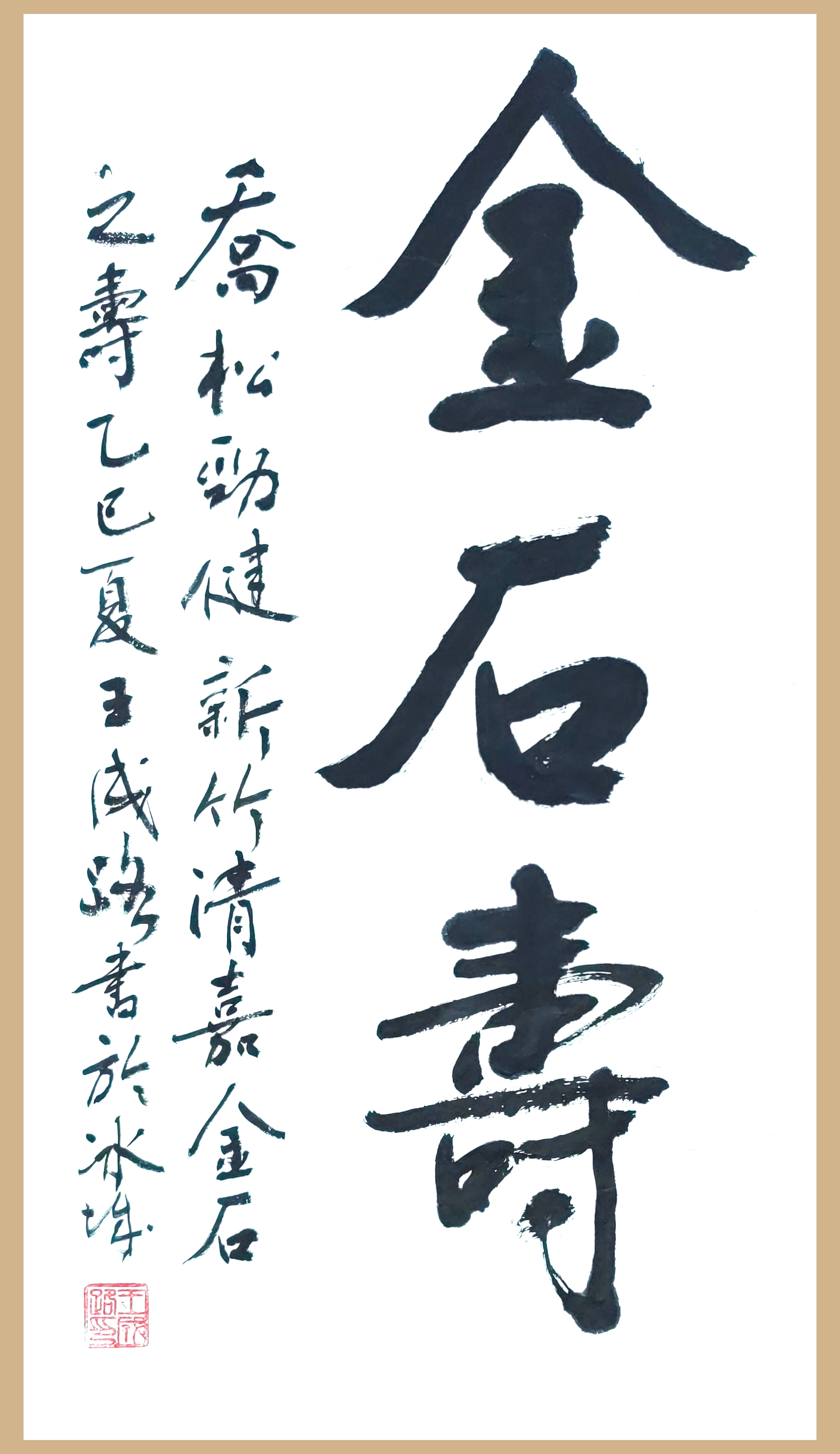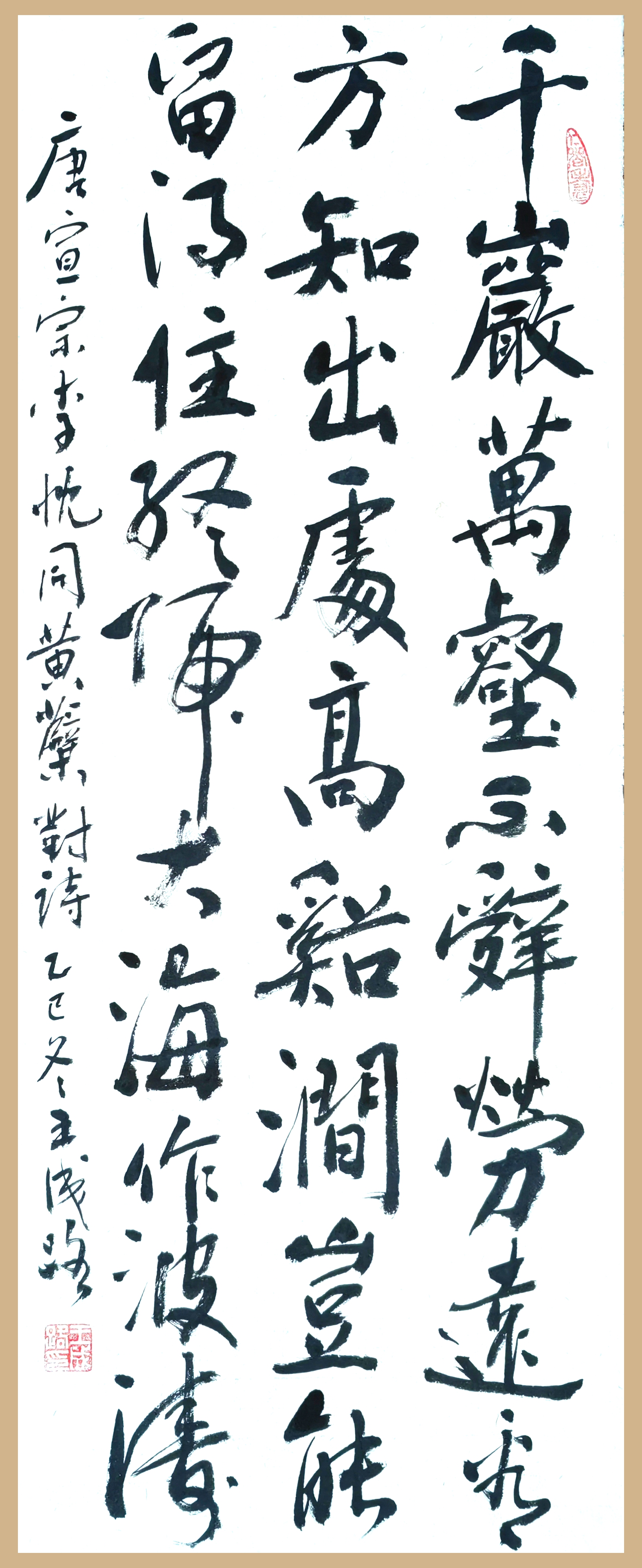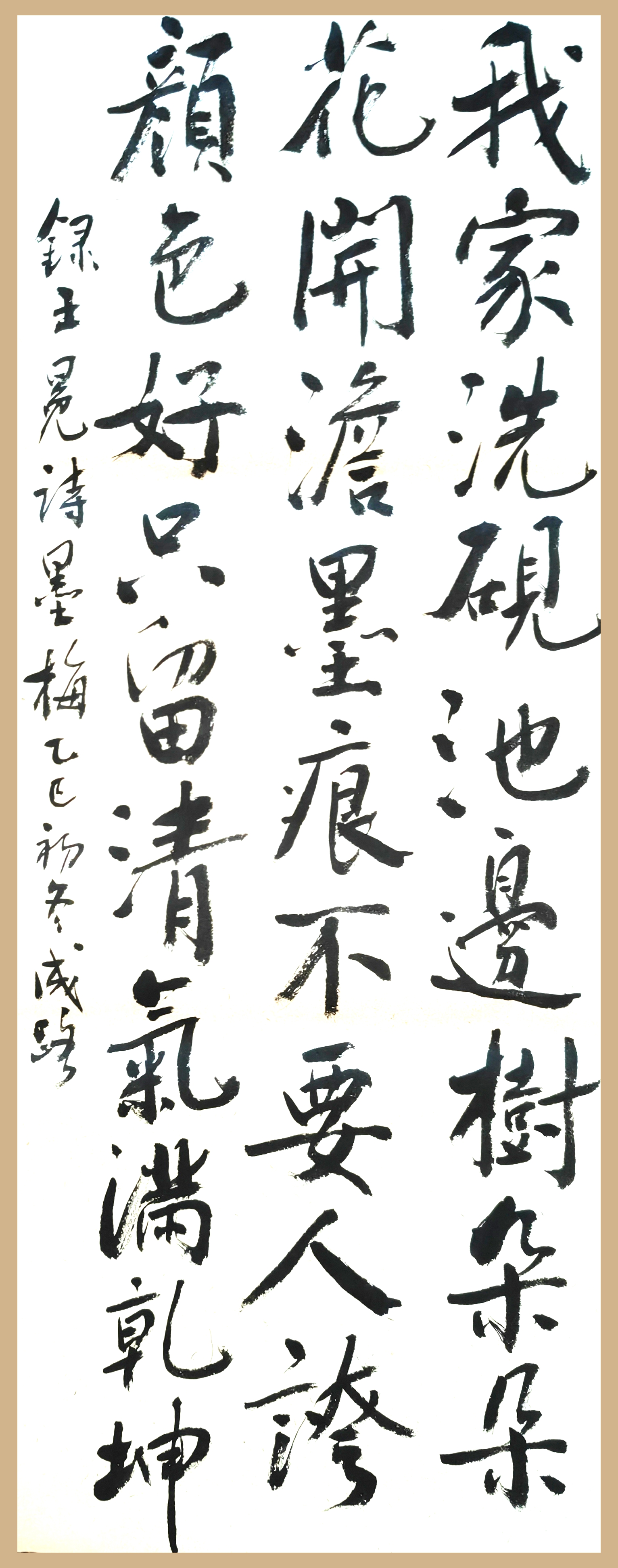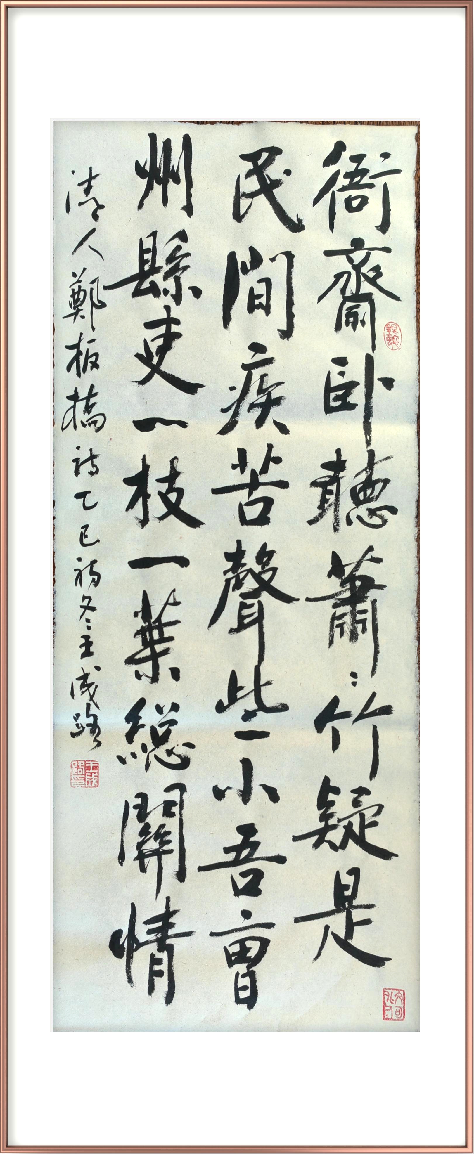 自少年始既爱好书法,10岁开始写春联,15岁时抄写大字报。参加工作后坚持业余临帖习字,近二十年来更是每天必练书法。楷书临颜体,行书喜临黄山谷诸帖,草书临《书谱》和《十七帖》等,隶书临《西狭颂》《石门颂》,同时喜欢临南朝的瘞鹤铭等。