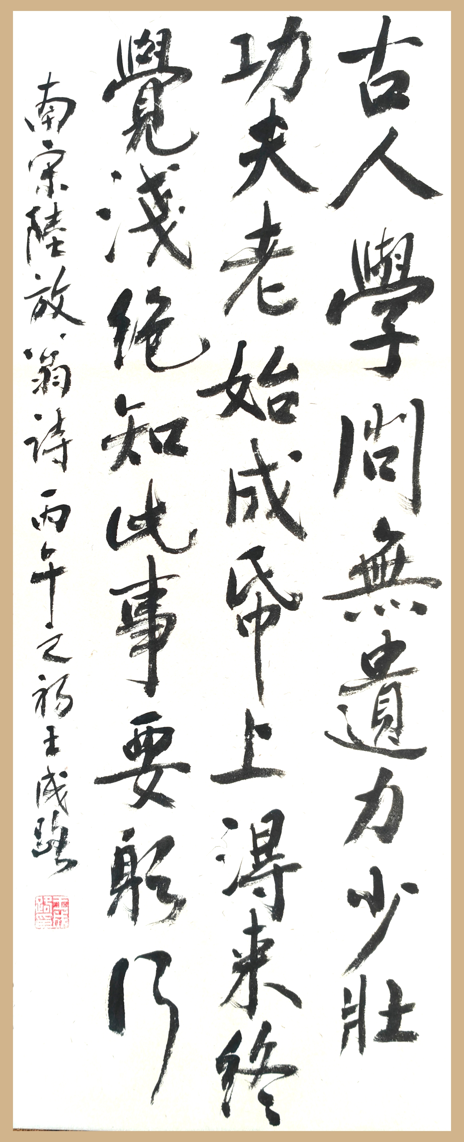 2016年参加国家开放大学书法高研班,聆听当代一些书法名家讲授,获益很大。王成路老师把学书感悟写成四句:“书法精妙世所无,看似寻常实畏途;潜心师古不收手,摆脱江湖远离俗。”