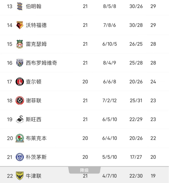 球队目前在英冠21轮积28分,相比高出降级区9分,离升级附加赛区更近,只有6分的差距,抢分意识不低。