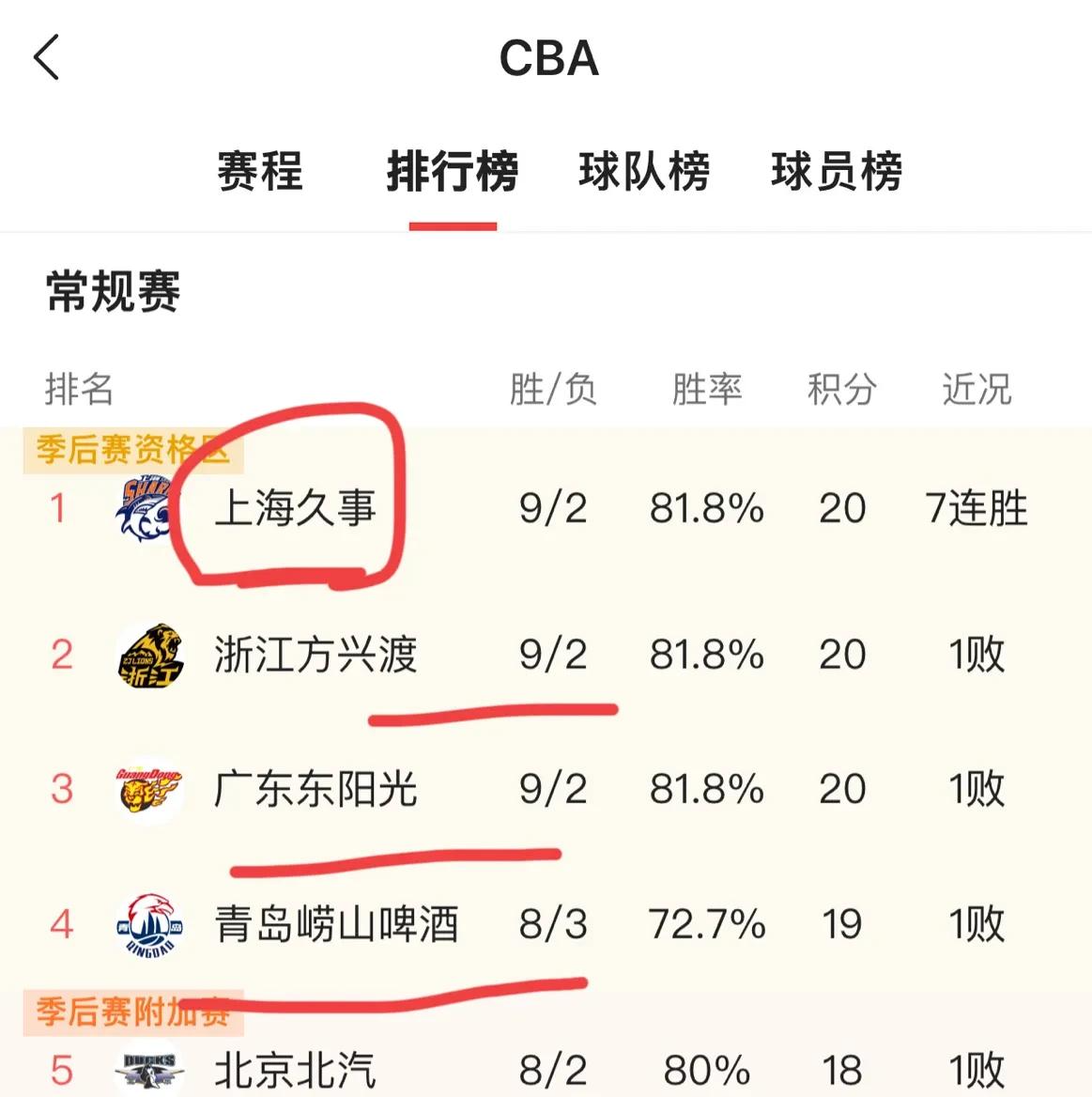 目前排行榜的前四名分别是上海男篮、广厦男篮、广东男篮、青岛男篮。
