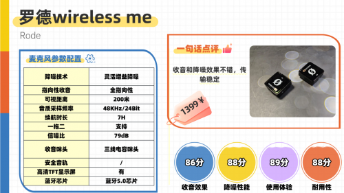 罗德Wireless ME在人声表现、操作便捷性和便携性上优势明显,是新手入门及轻量创作的理想装备。缺点在于传输距离较短、缺乏多通道扩展和专业内录功能,对专业团队的复杂拍摄需求支撑不足,更适合单人或双人的日常短视频、教学视频等场景。