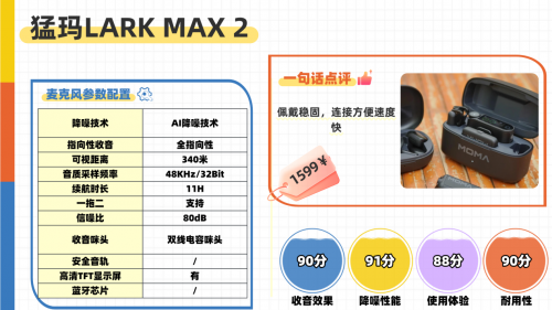 猛玛LARK MAX 2在传输距离、多通道能力、降噪效果、续航表现上均达专业级顶尖水准,是复杂场景拍摄的核心装备。缺点在于价格处于高端区间,对于仅需基础收音的个人用户性价比不足,但对于专业团队而言,其性能优势能显著提升创作效率,长期使用反而更具价值。