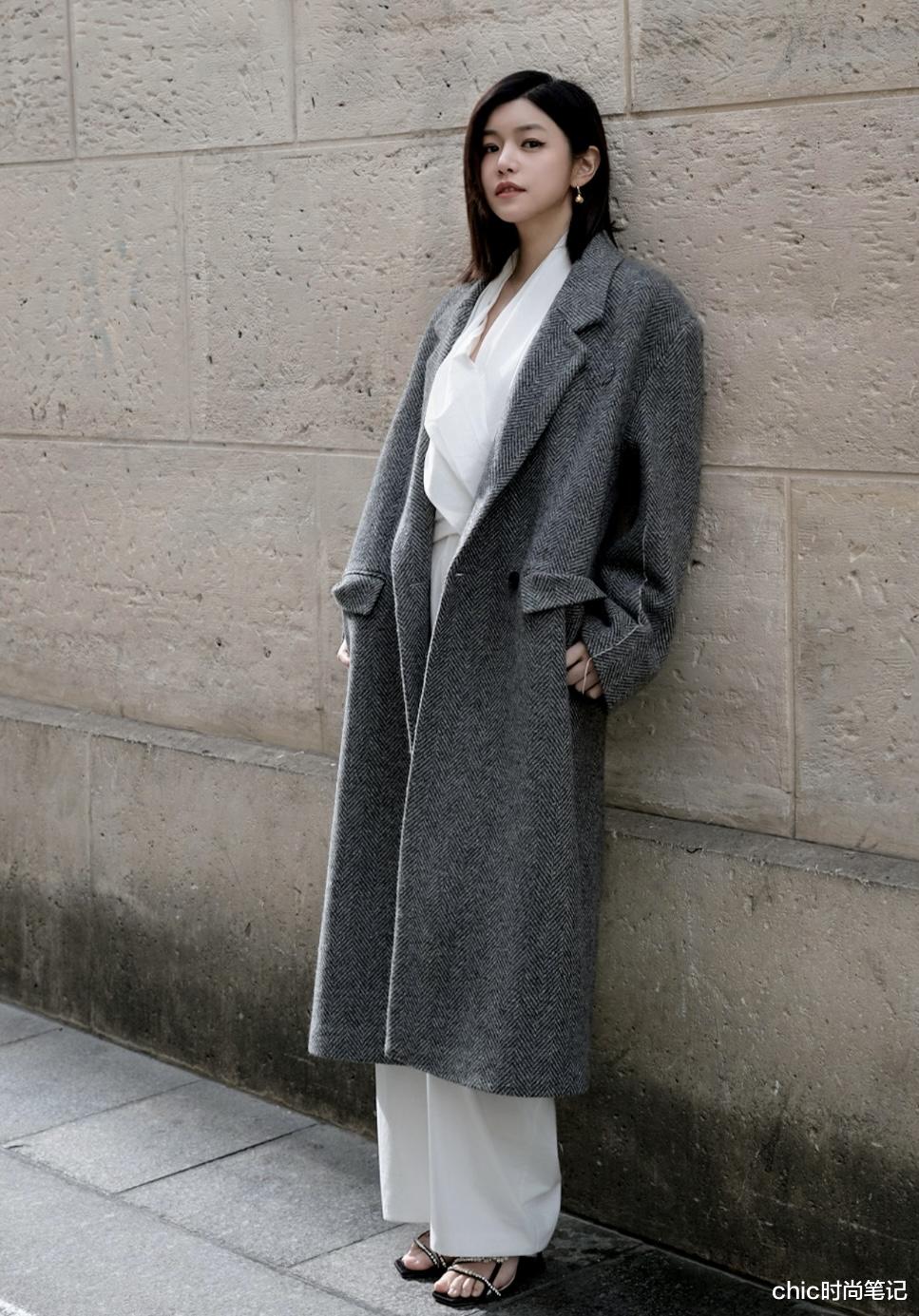 白色v领衬衫与白色西裤的搭配是职场OL的经典搭配。外搭一件灰色羊绒大衣,很适合秋冬的一套穿搭,唯一需要重新搭配的是鞋子,陈妍希搭配的高跟凉鞋,换做高跟皮鞋会更加适合当季所需。