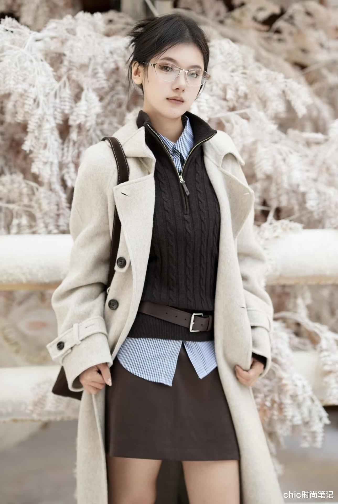 衬衫+针织衫+羊绒大衣,非常高知感的一套造型,一般下半身会选择短裙或者短裤,更具有时尚感,再搭配一双高筒靴,保暖与时尚的效果并存。