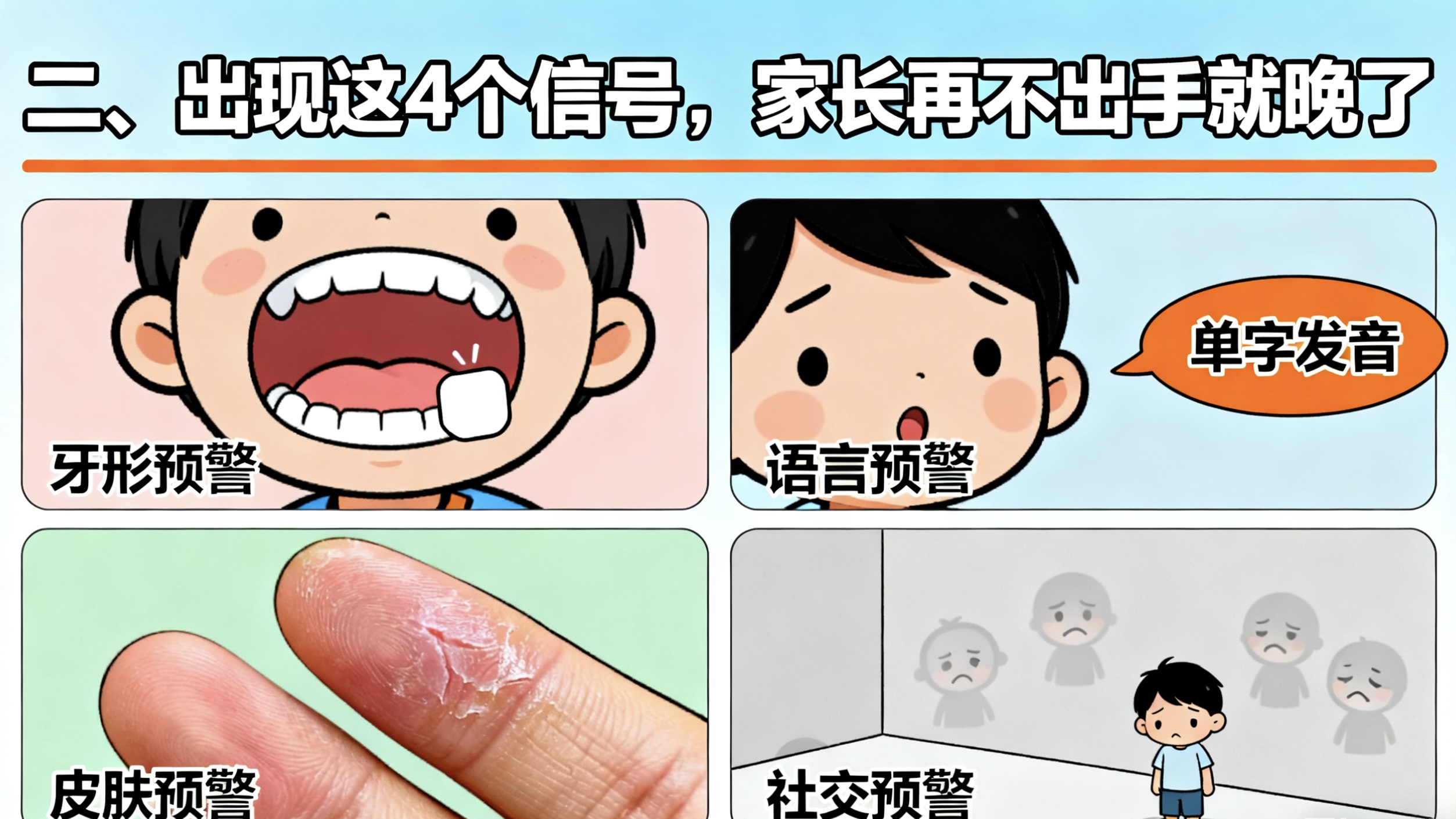 1. 牙形预警:上门牙外飘、下门牙内扣,出现“开颌”——咬面条咬不断。