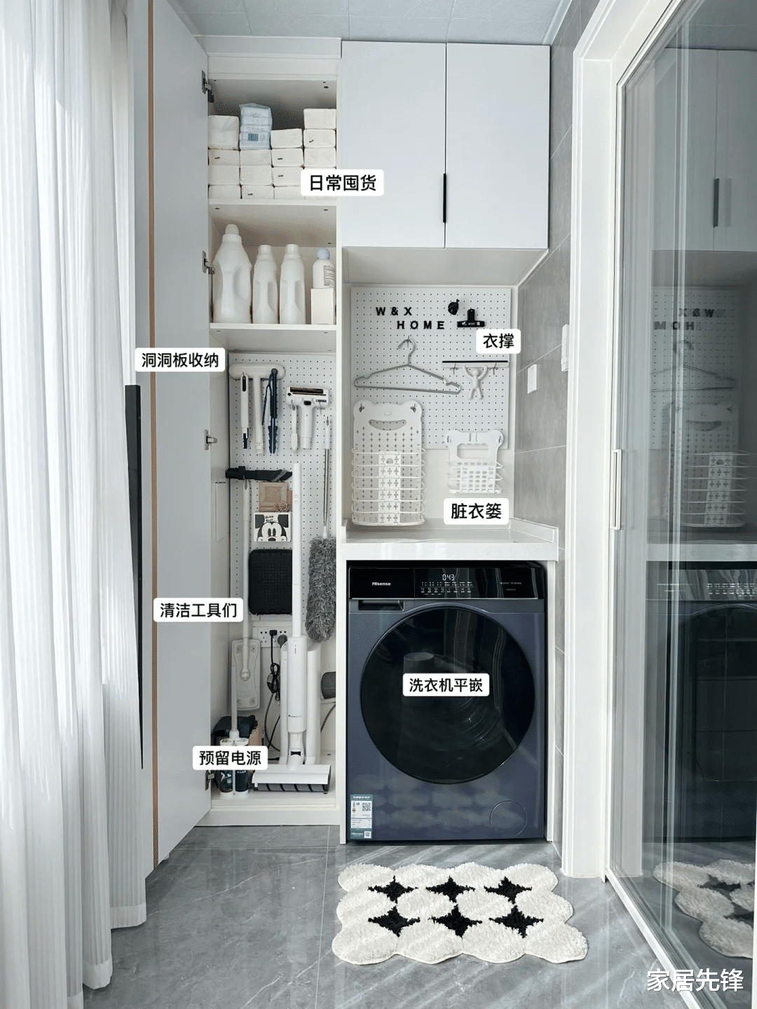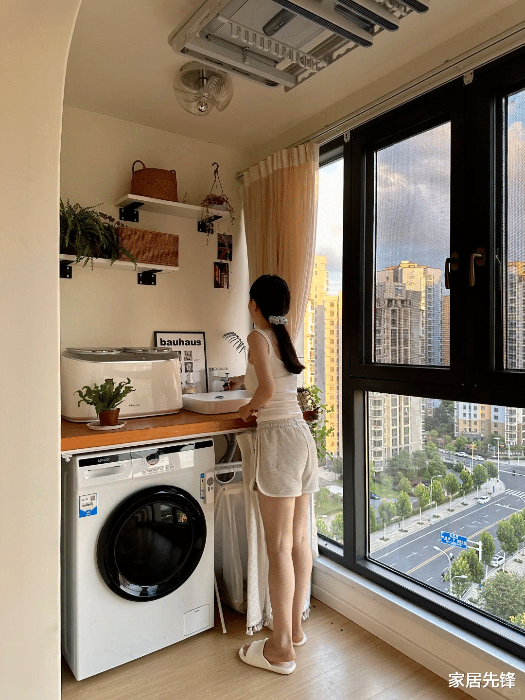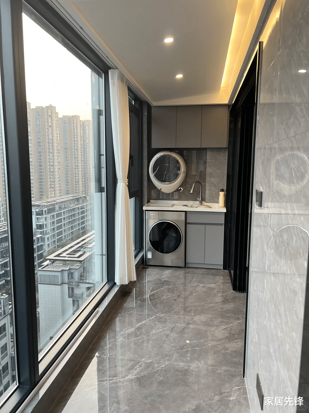 很多人都会把阳台用来晾晒衣服,那么我们在装修的时候可以直接在阳台上打几个柜子,然后将洗衣机、烘干机还有浴室柜,通通安装在阳台这个区域。