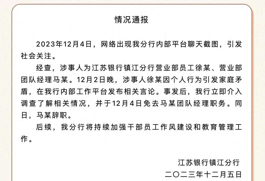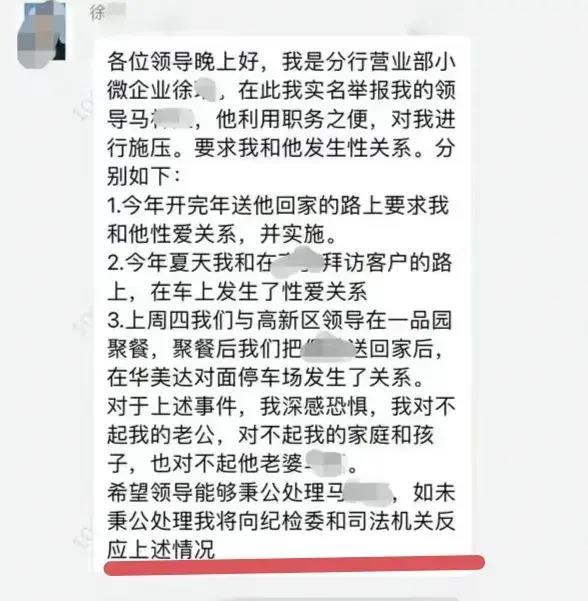 徐某在工作群中举报曾在一年时间内被领导马某某施压后发生过三次性关系,接到徐某的举报,银行方面也立即展开了调查,然后对马某某进行了处罚。