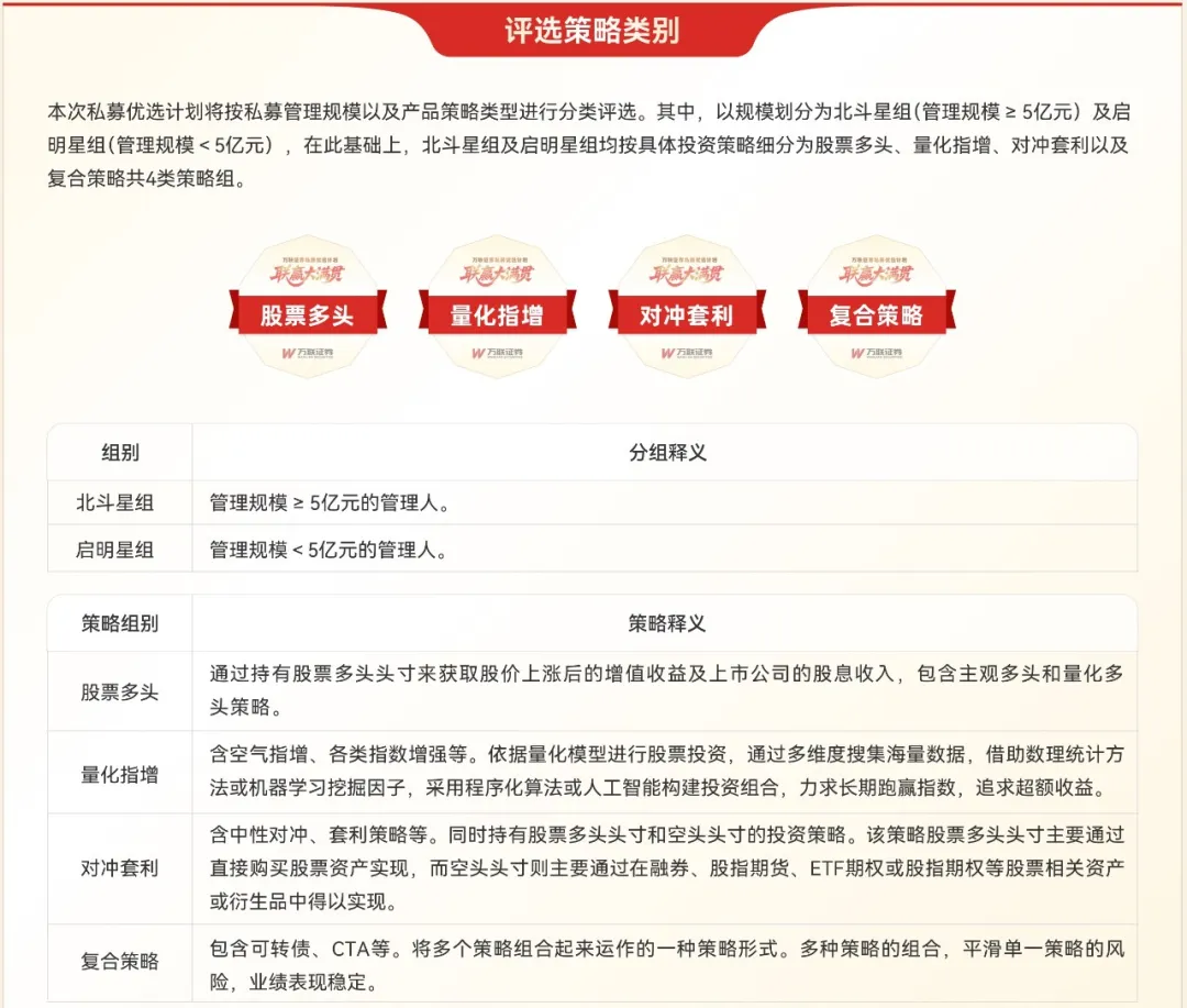 为确保评选的公平性与专业性,本计划根据私募管理规模及产品策略类型进行分类评选,按管理规模划分为“北斗星组”(规模≥5亿元)和“启明星组”(<5亿元),并进一步按策略类型分为主观多头、量化指增、对冲套利和复合策略四大类别。