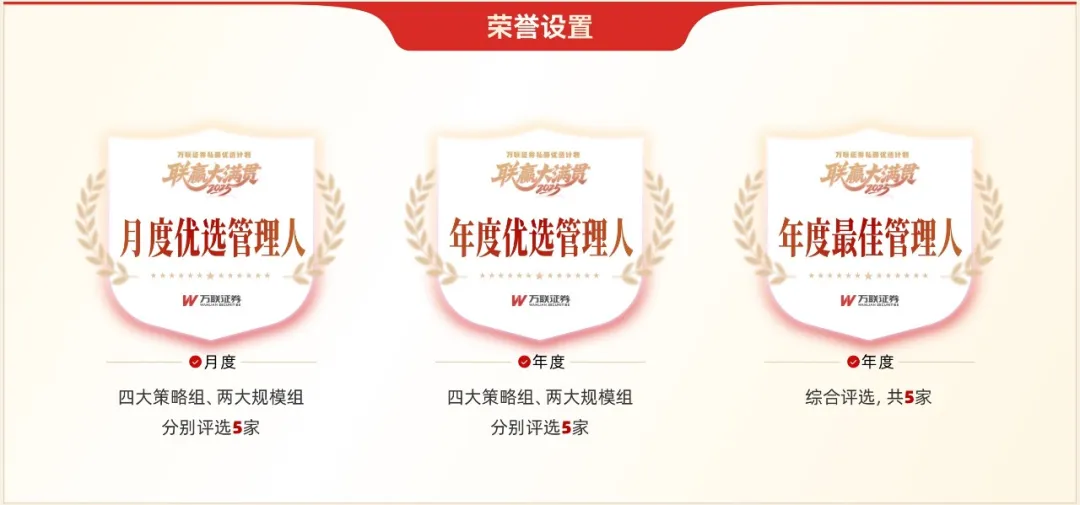月度荣誉私募管理人将获得专栏宣传、线上推广及交易系统支持;年度荣誉管理人可优先纳入万联证券代销白名单、智选88组合观察池及百亿FOF联盟资金池;最佳管理人荣誉获得者除享有所有年度荣誉的活动权益,还将获得主办方提供的全方位合作服务支持。