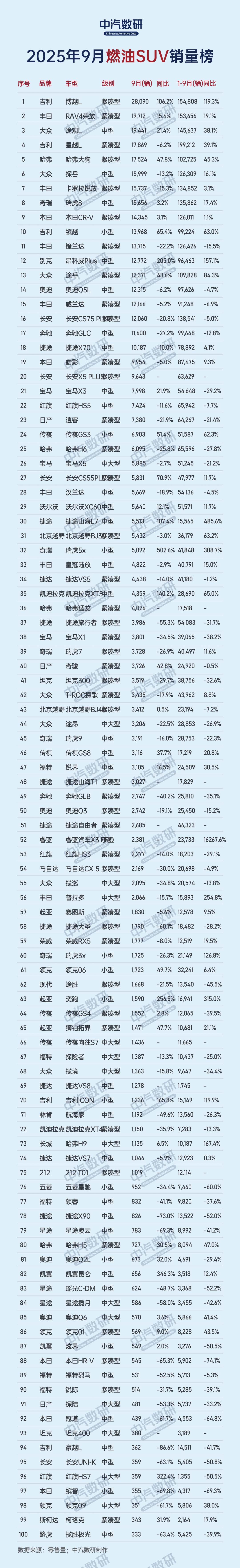 然而,在新能源车市场渗透率接近60%的环境下,燃油SUV市场正经历结构性复苏,但头部效应明显加剧,仅3款车型销量在两万辆左右。不过当月有17款车型实现月销破万。自主品牌吉利博越L以2.81万辆的成绩登顶燃油SUV市场,丰田RAV4荣方则以1.97万辆的成绩居合资品牌燃油SUV销量榜首。