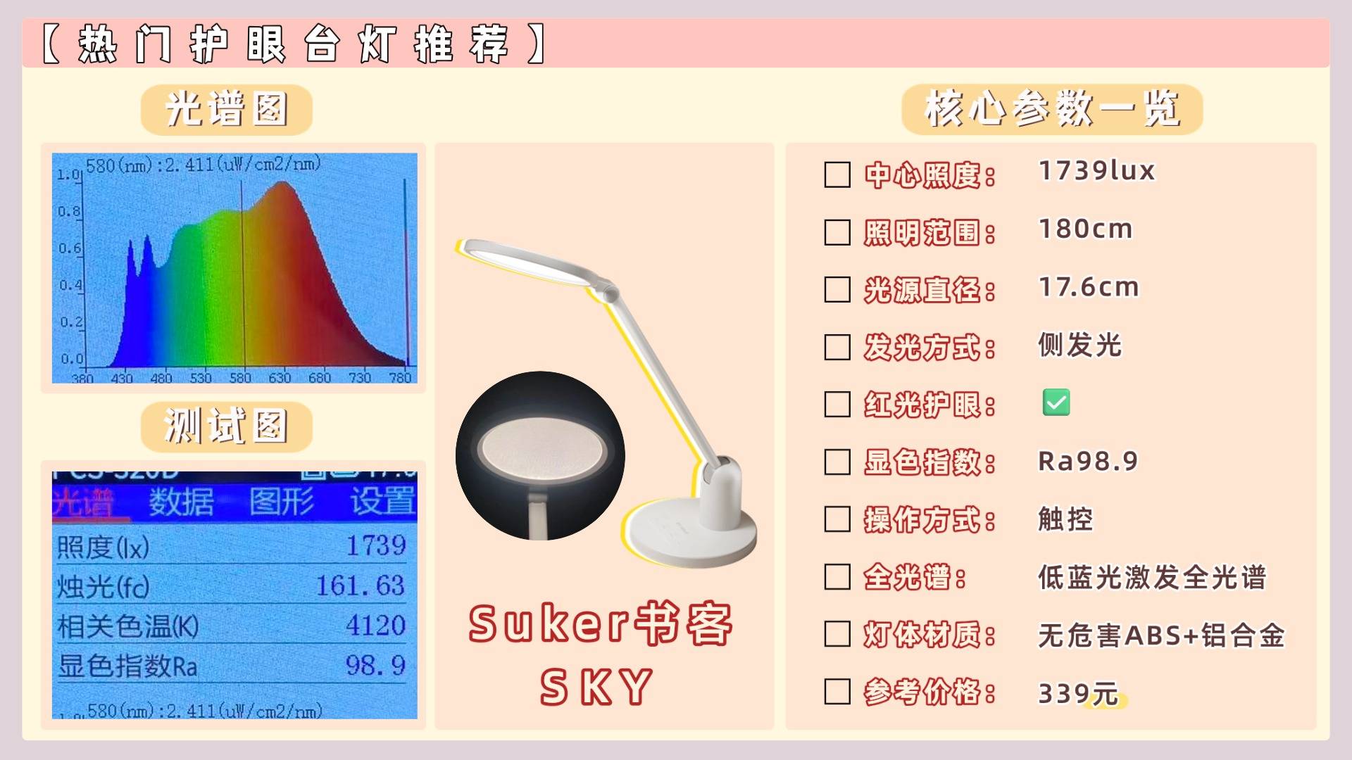 为了解决市面上百元护眼台灯护眼效果不足的问题,书客sky坚守了一直以来「明·护·广·养 」四重守护理念,通过八年以上的护眼研发经验,突破了传统照明技术的局限,专研出SunSilk™护眼芯片和5域环控光学系统的创新性组合,通过高密度导光板与多层扩散膜组合,结合类自然光谱智能驱动,形成多维度光线调节机制。结合DT多维漫射2.0技术,光线在发出的过程中经过精密漫射与动态校正,实现全方位柔和覆盖。它家创新设计了RRT2.0硬核养眼黑技术,相比传统的护眼台灯,能够更加精准的抑制住400-450nm有害高能蓝光,将红光效果增强至极限,每天“三分钟”即可为眼部输送养分,也正因如此,书客sky成为了百元价位深度护眼的理想之选,护眼性能使用非常卓越!