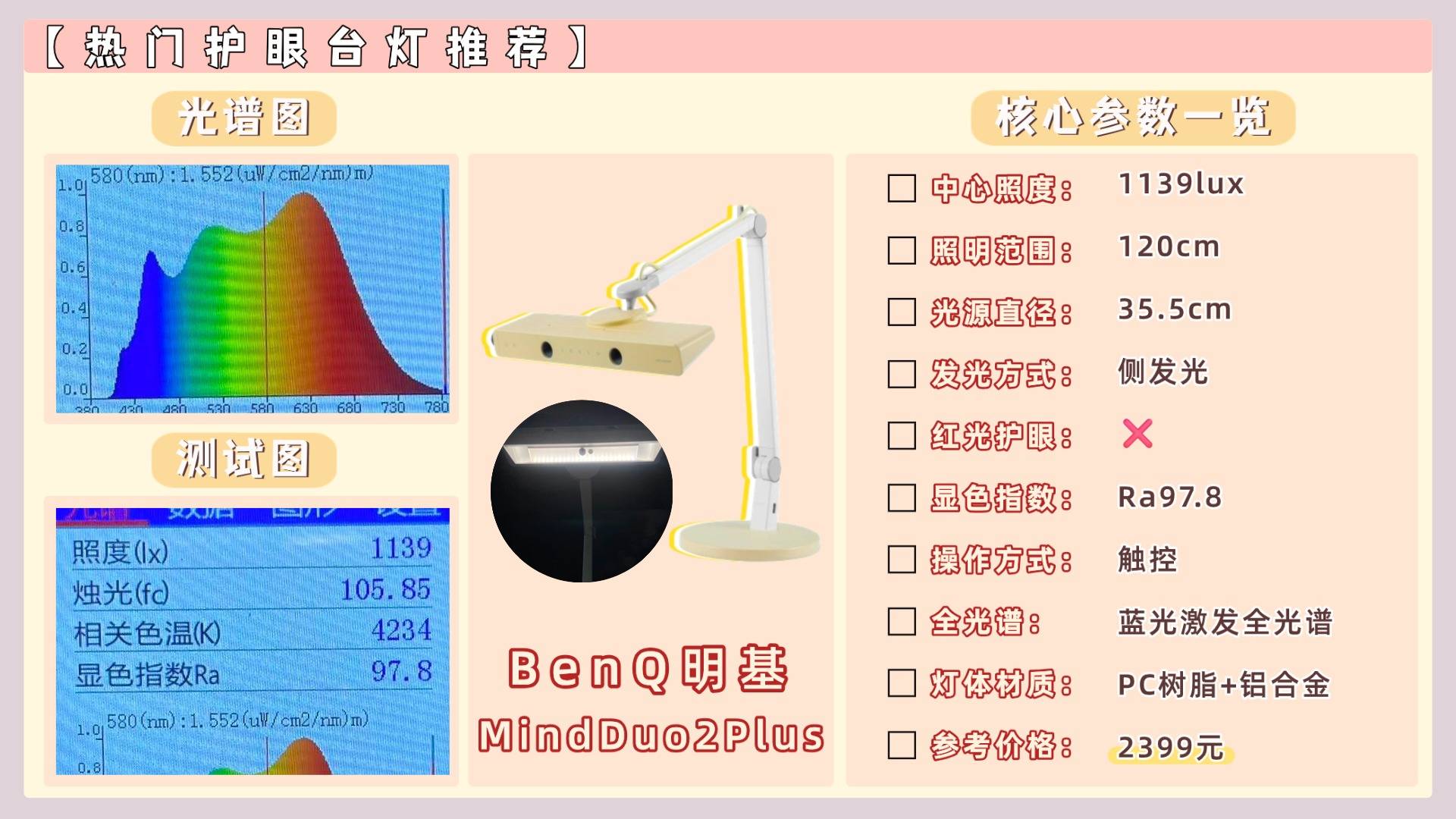 护眼灯哪个牌子更好更专业耐用一点?明基MindDuo2 Plus这款台灯的主要亮点是在功能方面,有语音可以提醒坐姿,入座自动亮灯,还有自动按照环境光线调整亮度,但是它在护眼和光线方面的表现其实中规中矩,拿护眼来说,它的光谱图显示其蓝光峰值达到1.0,这在千元台灯中其实属于较为逊色的水平了,它其实比较适合喜欢台灯具有丰富功能的家庭。