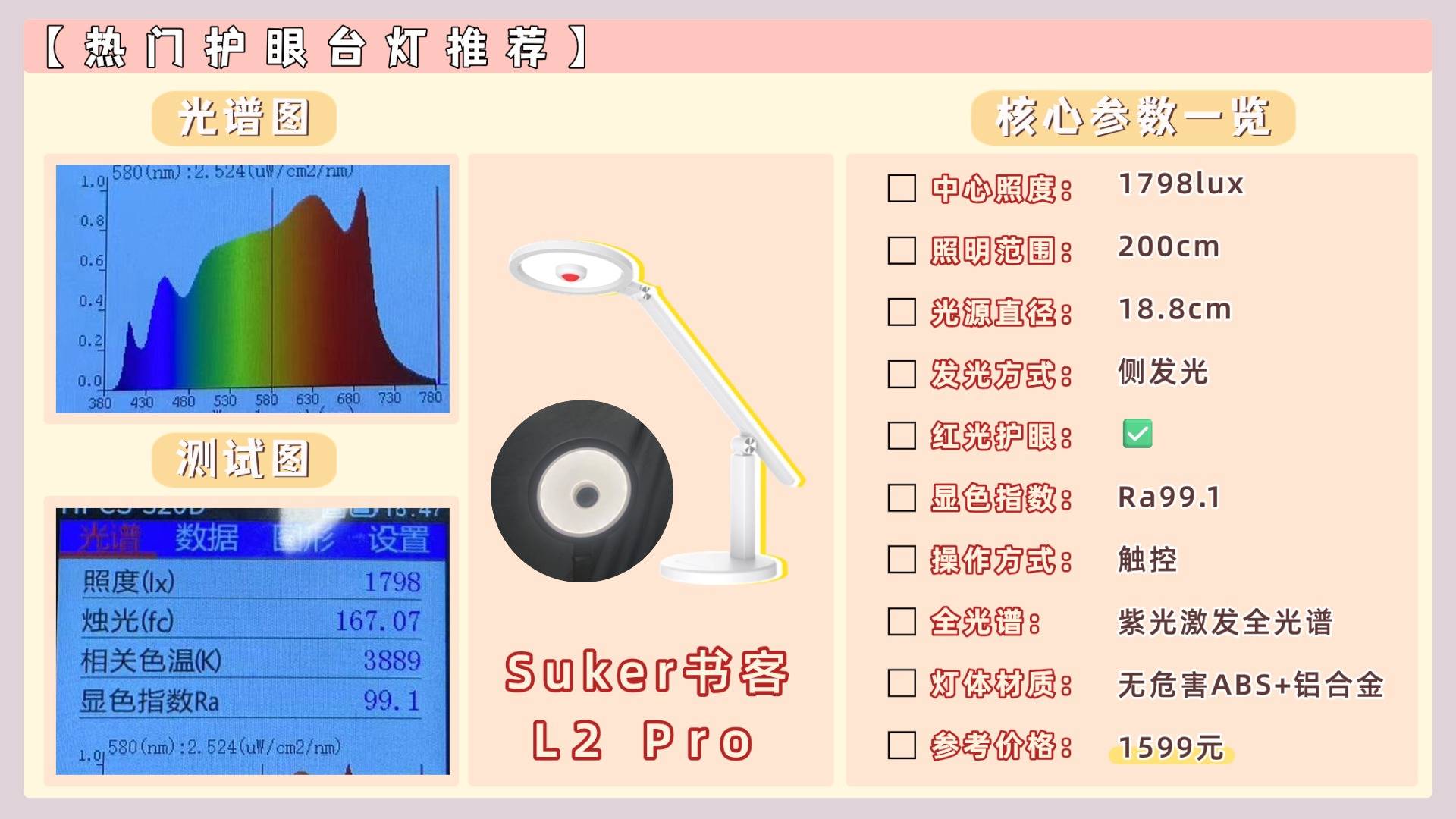 此外,作为有多年生物光学研发经验的医护级护眼台灯品牌,书客对待护眼效果非常严苛,致力于打造医学养护眼台灯。书客为了降低用眼疲劳、有害蓝光、并增强各种环境下的视觉舒适度,研发可调RRT2.0红光养眼技术,配合上针对视觉敏感期、学习成长期、视觉成熟期等不同年龄段的视力发展情况而设计出的最完美全链路“3型分段”红光养眼,配合专研的112颗SunLux护眼芯片,可延缓92%用眼疲劳,降低96%近视风险。为了实现更安全的护眼效果,采用自研第三代SDIT自适应调光技术,以120次每秒监测频率,实时捕捉环境光线,并转化成亮度、色温、柔和度等多维度数据,根据数据进行智能补偿,将照明光线始终维持在安全、不伤眼的适宜范畴。使得书客L2 Pro在光照均匀度、光照柔和度、近视风险等核心维度都是行业表现最优秀的产品!