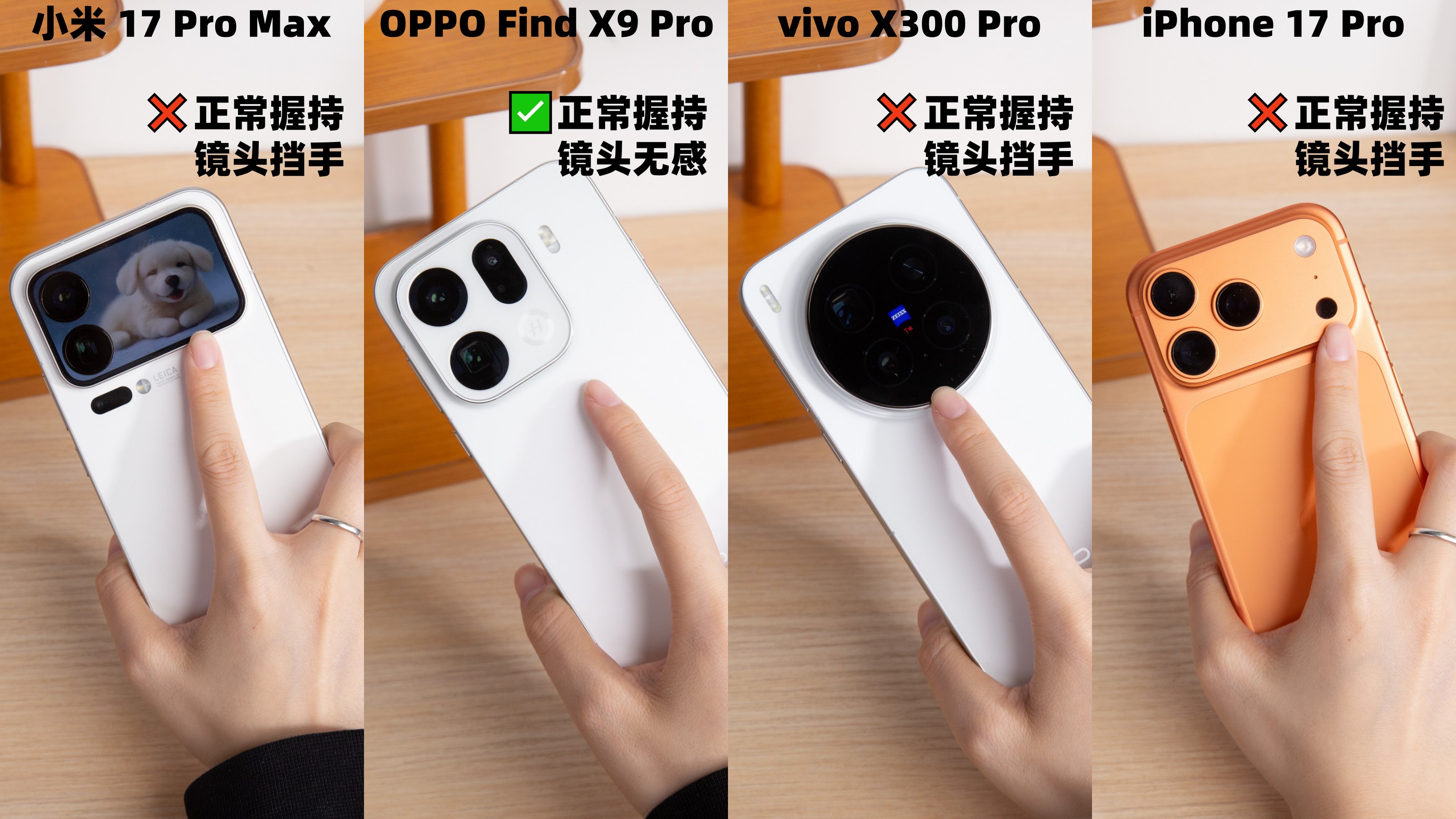 1.手感:今年的大杯旗舰有居中大圆派,有横向大矩阵派,但抛开颜值设计等主观因素不谈,改为左上角矩阵的OPPO Find X9 Pro确实是第一名~不仅是正常拿着的时候不会有镜头模组过大而产生的头重脚轻感,而且竖着刷短视频/横着打游戏手指也能很舒服地放着,镜头一点都不硌手。