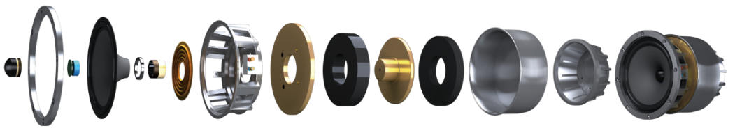 这样,我们是否可以在下方,放置一枚独立的低音扬声器呢?答案是完全可行的!同轴三分频扬声器,既保证了同轴单元零相位失真的优点,保证了声音的空间感与成像的清晰度,同时通过引入独立的低音单元,实现了中音与低音的物理分离。