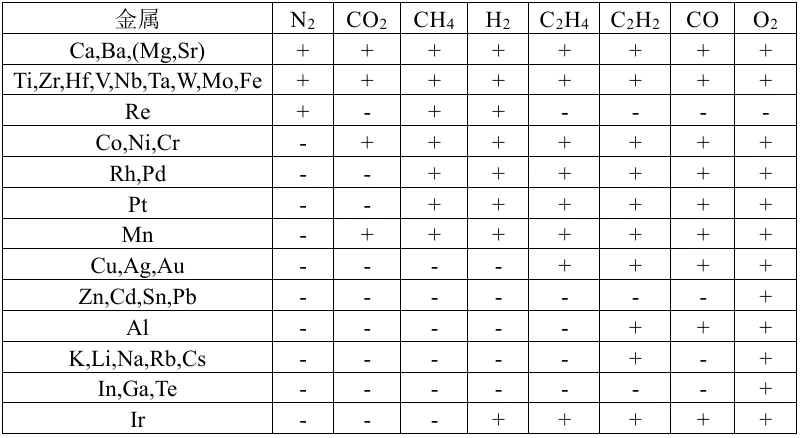 化学吸附的一个很重要的特点是它吸附的特定性很强,只吸附于某些物质的表面。表1 气体在金属上的化学吸附