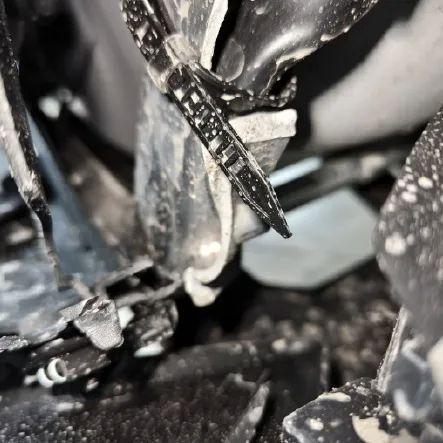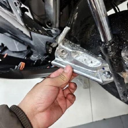 首先我们根据事故车来看看具体是哪一个部位发生了断裂的情况。事发车友提供的照片可以看到,发生碰撞的位置在车身底部右前侧部位。根据官方此前公布的车架结构判断为外延安装支架,从断裂的车架照片能够清晰看到断裂痕迹。