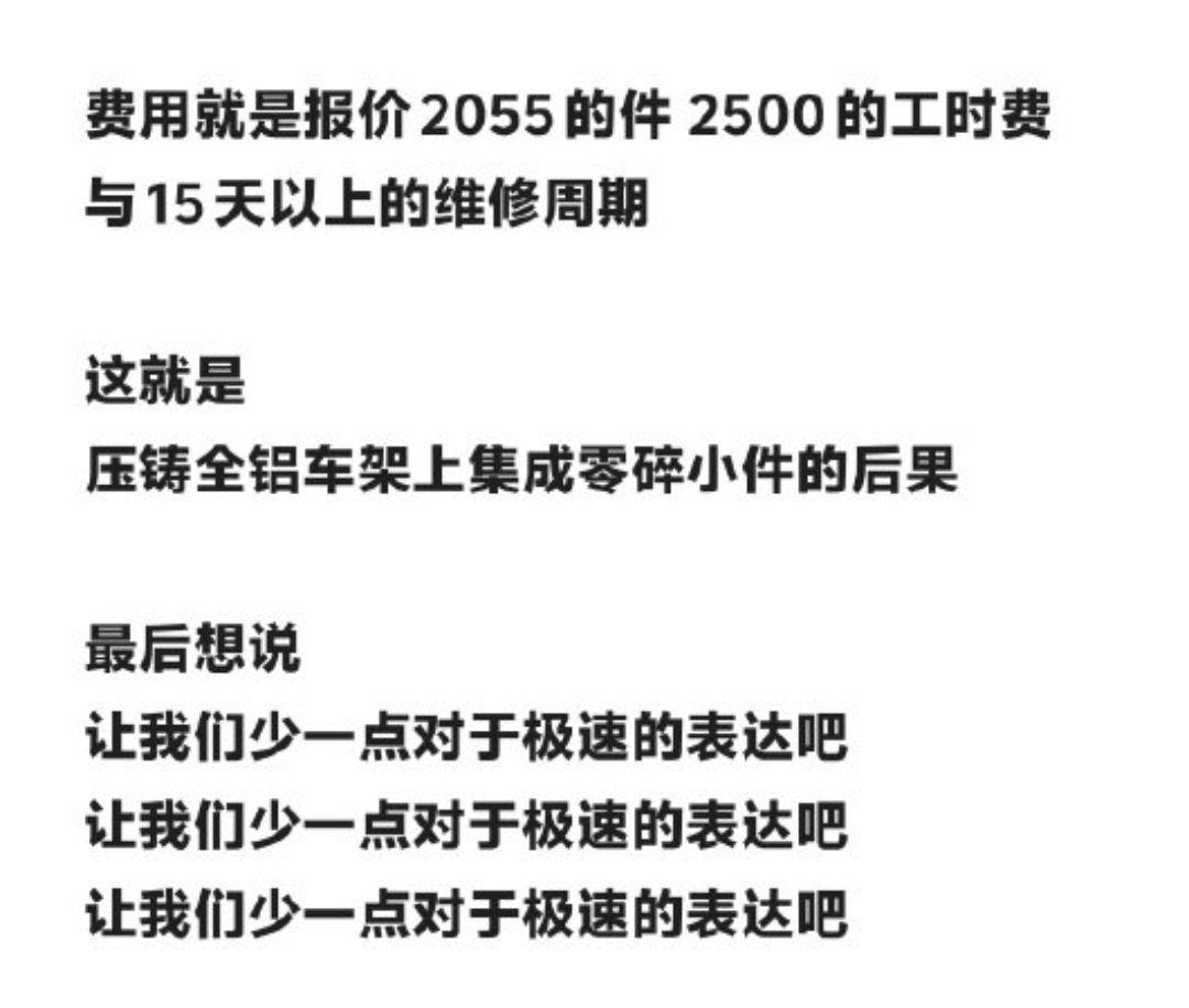 我们再把目光回到这次车架断裂的问题上,铝合金车架成本比钢管车架高这一点毋庸置疑,它最大的特点就是“轻”而且车架的一体性更强,但它的缺点则是“脆”维修成本高。反之,钢管车架虽然“重”但它更具韧性,维修成本也低。相信购买升仕150X的绝大部分车都未必会考虑到它的缺点,毕竟在优点面前缺点会变得更加渺小。根据事发车友提供的维修信息可以看到,这台新车维修报价包含:1️⃣2,055元的配件费用;2️⃣2,500元的工时费以及15天以上的维修周期。而且在事发车主的叙述中,认为这就是压铸全铝车架上集成零碎小件的后果。