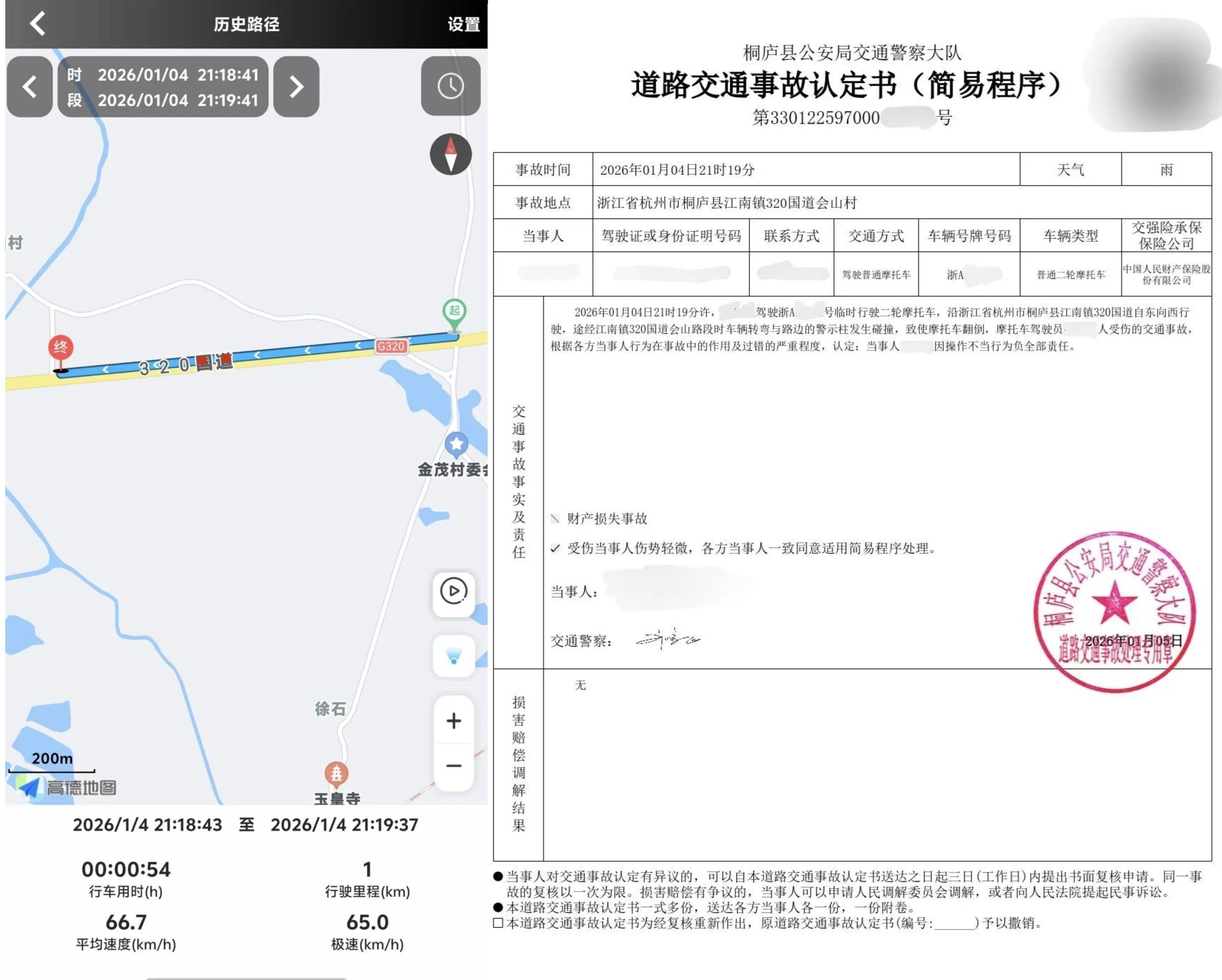事发车友还在微博上传了撞击前最后一分钟的数据,展示极速为65km/h,对于升仕这台高性能150踏板而言,这个速度相比官方测试的极速而言确实不快(新320国道江南镇段限速70km/h)。从事故认定书中获悉,事发车主在320国道江南镇路段转弯时与警示柱发生侧面碰撞导致侧翻,并且事发车主也有受伤。从车主微博提供的事故现场照片,当天为雨天路面湿滑,估计视线也不好。