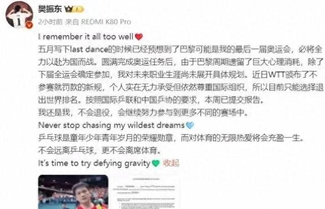 12月27日,中国男乒奥运冠军樊振东在社交媒体发布了一则令人震惊的消息,他已经正式向国际乒联申请退出世界排名。原因是因为身体无法支撑WTT的强制参赛需求。