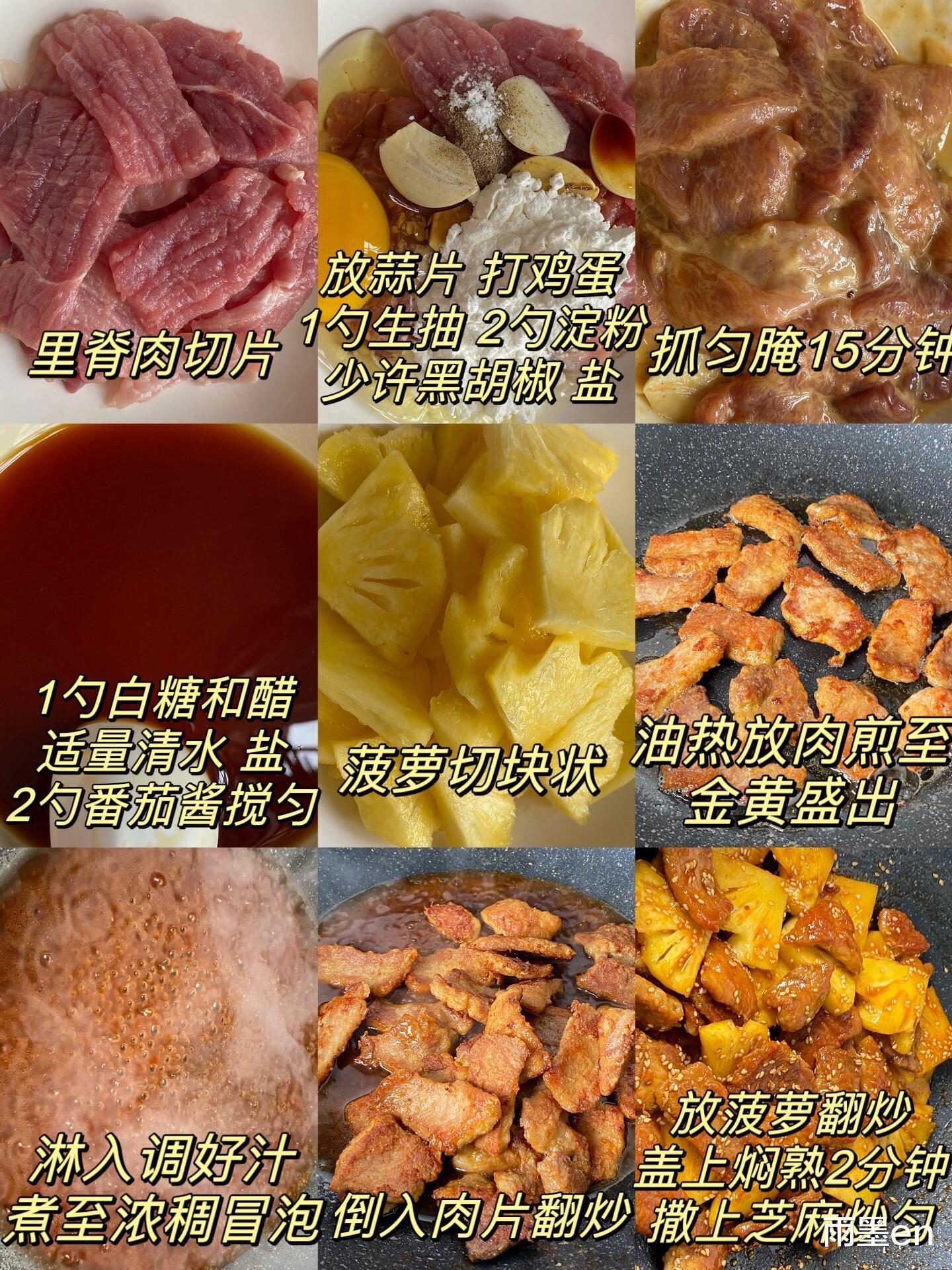 做这道菜不用特意囤食材,家常冰箱就能凑齐:猪里脊肉(或猪排)200克、新鲜菠萝100克、鸡蛋1个、玉米淀粉2勺、面包糠3勺、蒜末2瓣、生抽1勺、料酒1勺、盐少许、白糖1小撮、番茄酱1勺、清水半碗。食材都是超市常见款,菠萝选熟透的更甜,猪里脊嫩度够,炒出来不柴。